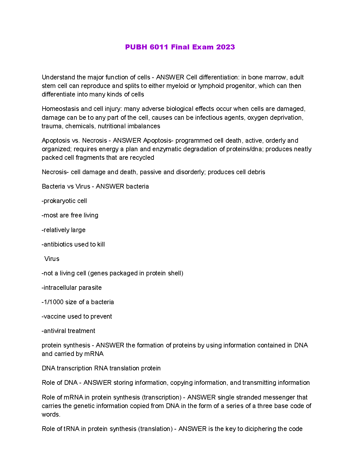 Get ready to ace your PUBH 6011 Final Exam with this comprehensive study guide. This resource covers all the key concepts you need to know, including cell differentiation, homeostasis, apoptosis, necrosis, and more. With clear explanations and practice questions, you'll be well-prepared to tackle even the toughest exam questions on your first attempt.