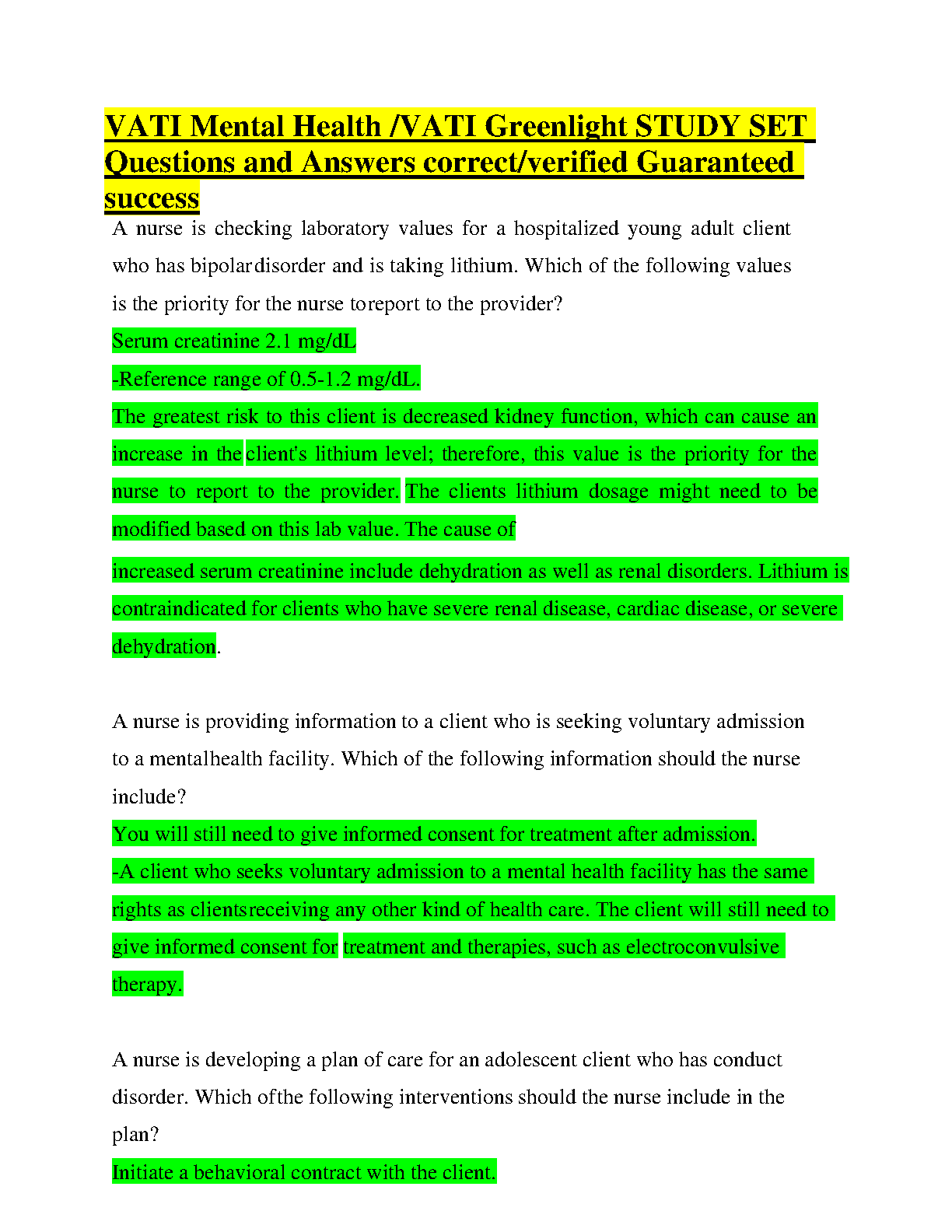 VATI Mental Health /VATI Greenlight STUDY SET Questions and Answers correct GRADED A+. DOWNLOAD on www.hackedexams.com INSTANTLY.
