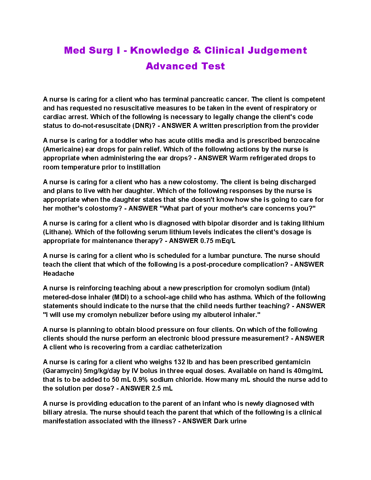 Med Surg 1 - Knowledge & Clinical Judgement Advanced Test 2024/2025 - Pass Your Exams On First Attempt!