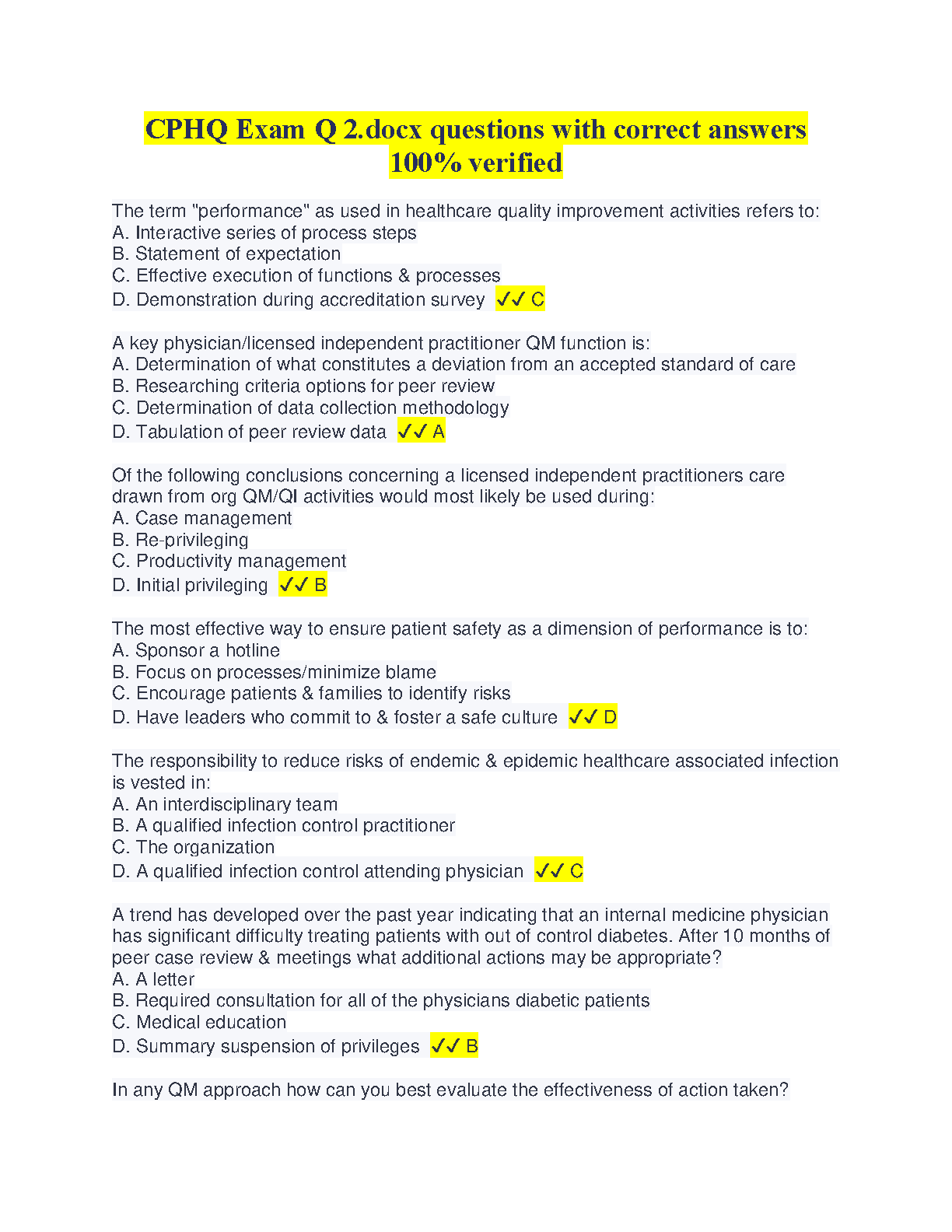 CPHQ Exam Q 2.docx Questions with Correct Answers 100% Verified