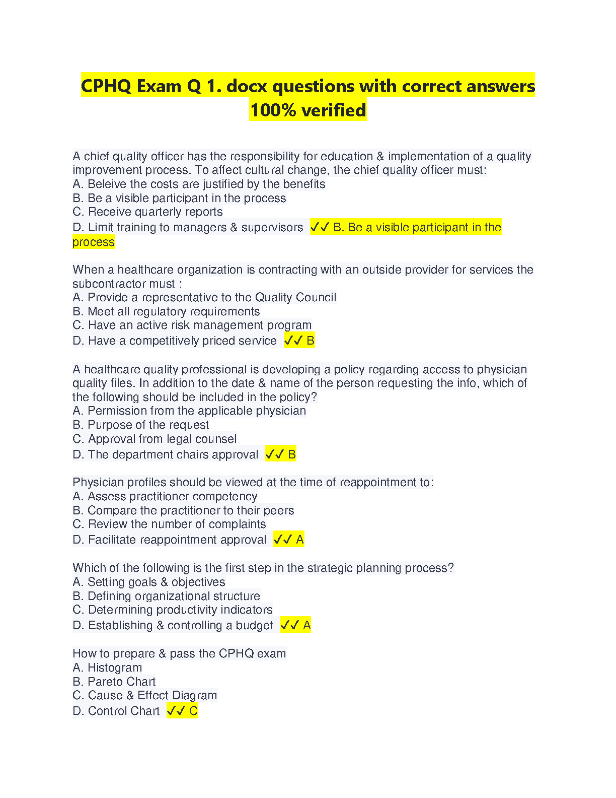 This document contains a set of CPHQ Exam questions with their corresponding correct answers. It is designed to help students pass their CPHQ exam on the first attempt, ensuring they avoid resits. The questions cover various aspects of quality management, including the role of the quality officer, contracting with outside providers, and strategic planning.