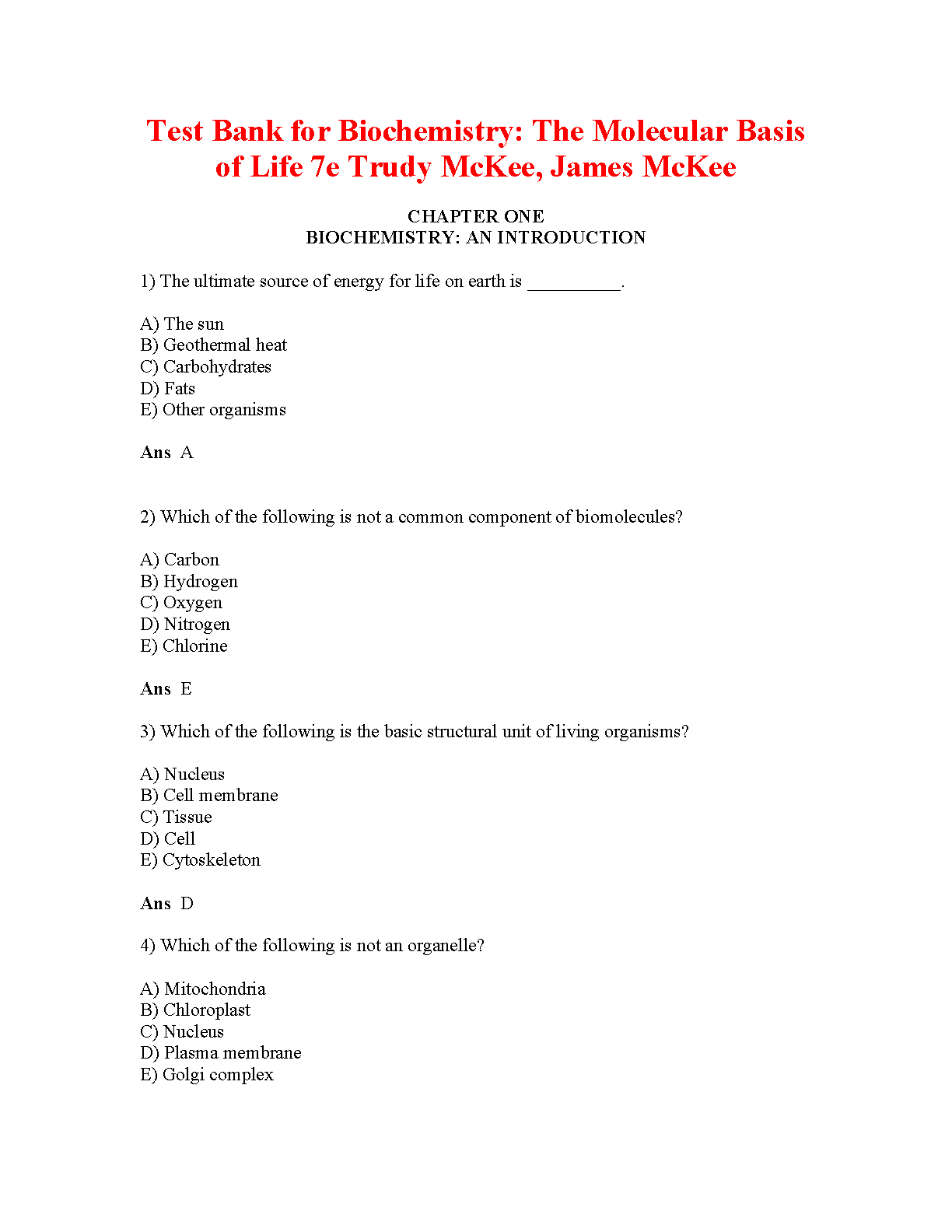 Biochemistry: The Molecular Basis of Life 7e Test Bank - Trudy McKee, James McKee