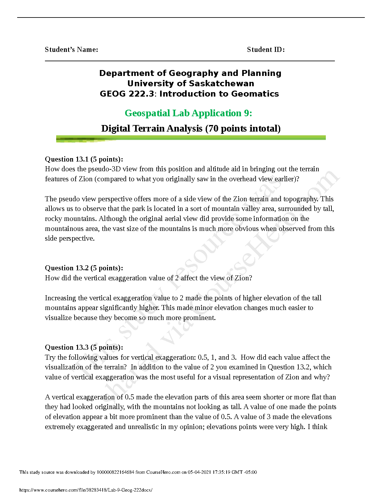 Geospatial Lab Application 9: Digital Terrain Analysis (70 points in total) - Introduction to Geomatics (GEOG 222.3) by Dr. David A. (Dave) Benton