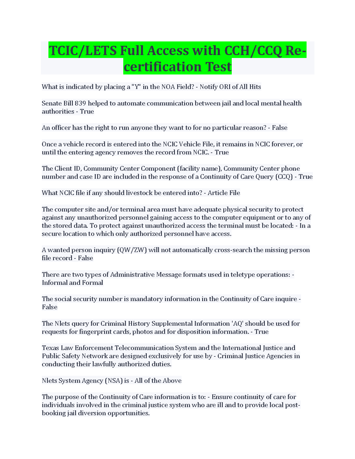 TCIC/LETS Full Access with CCH/CCQ Recertification Test - 2024/2025 Edition - Pass on the First Attempt
