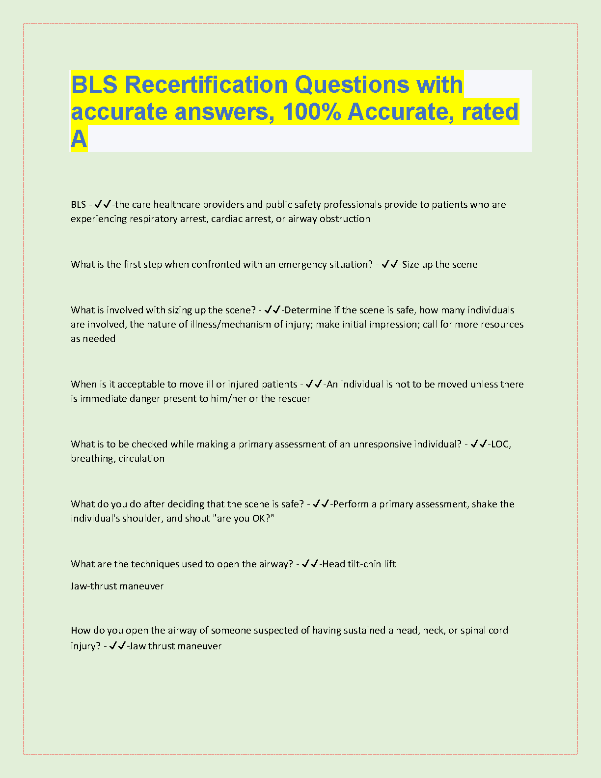 BLS Recertification Questions with Accurate Answers: 2024/2025 Edition for First Attempt Success