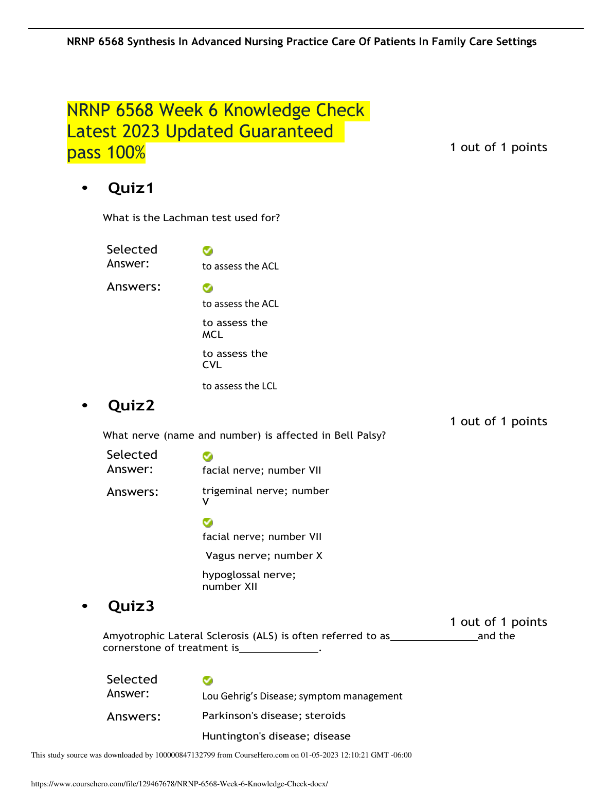 NRNP 6568 Week 6 Knowledge Check Latest 2023 Updated Guaranteed pass SCORED 100%. DOWNLOAD on www.hackedexams.com INSTANTLY.