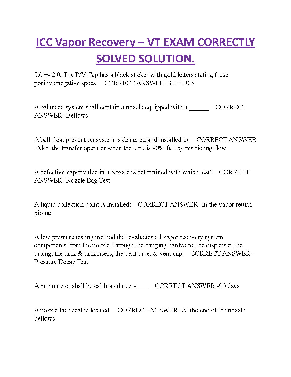 This resource contains a collection of multiple-choice questions and answers related to the ICC Vapor Recovery - VT Exam. The resource is designed to help students prepare for their exam and to achieve a passing score on their first attempt.
