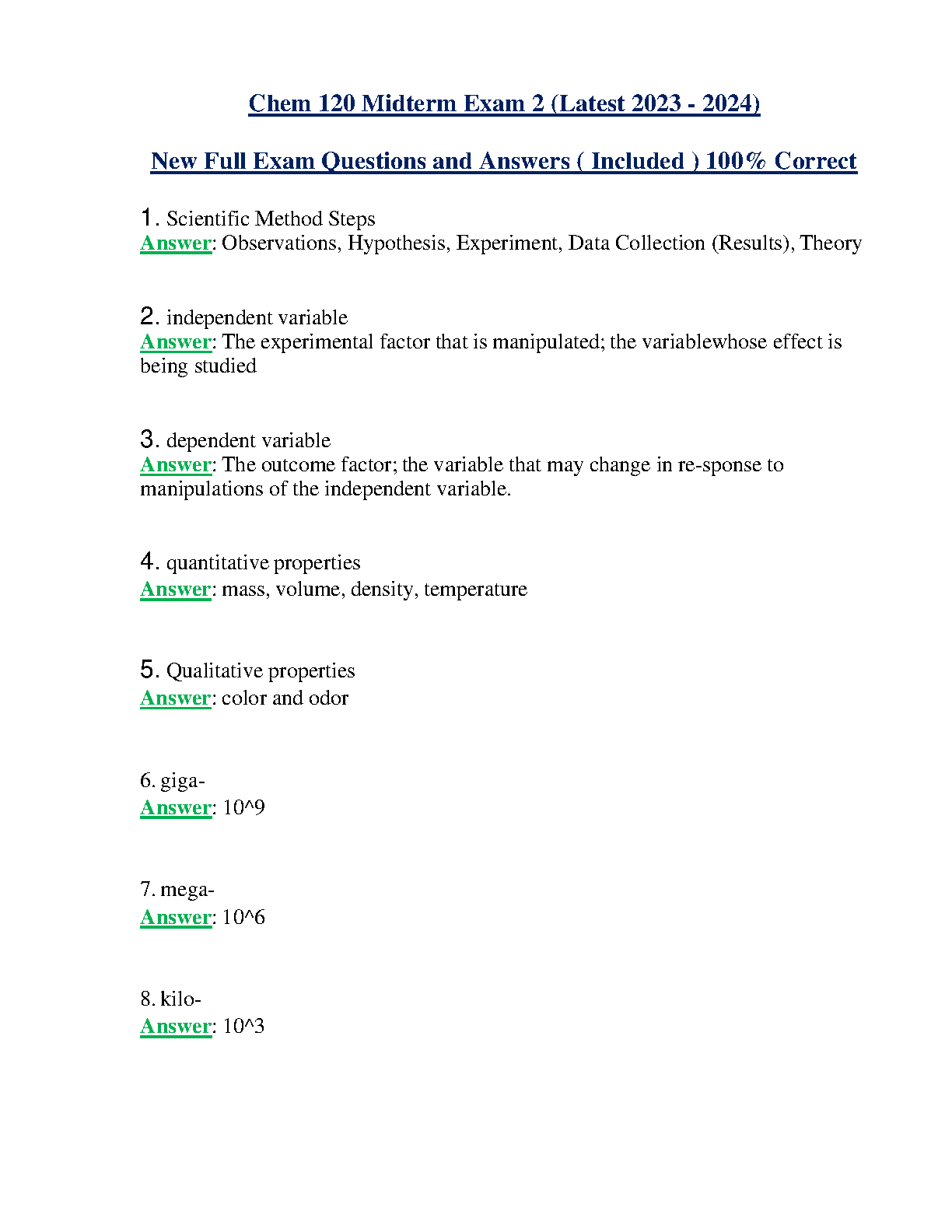 Chem 120 Midterm Exam 2 (Latest 2023 - 2024) - New Full Exam Questions and Answers (Included) 100% Correct