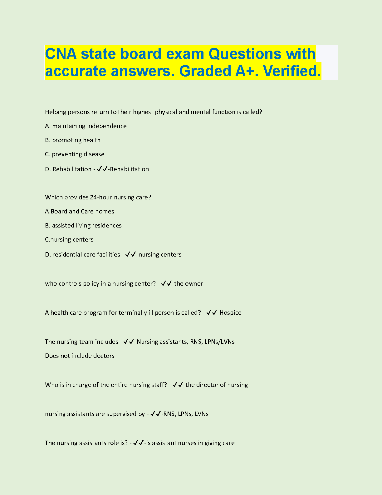 Ace your CNA state board exam with confidence using these comprehensive practice questions, featuring accurate answers. Each question is graded A+ and verified for accuracy, ensuring you're prepared for real-world scenarios.
