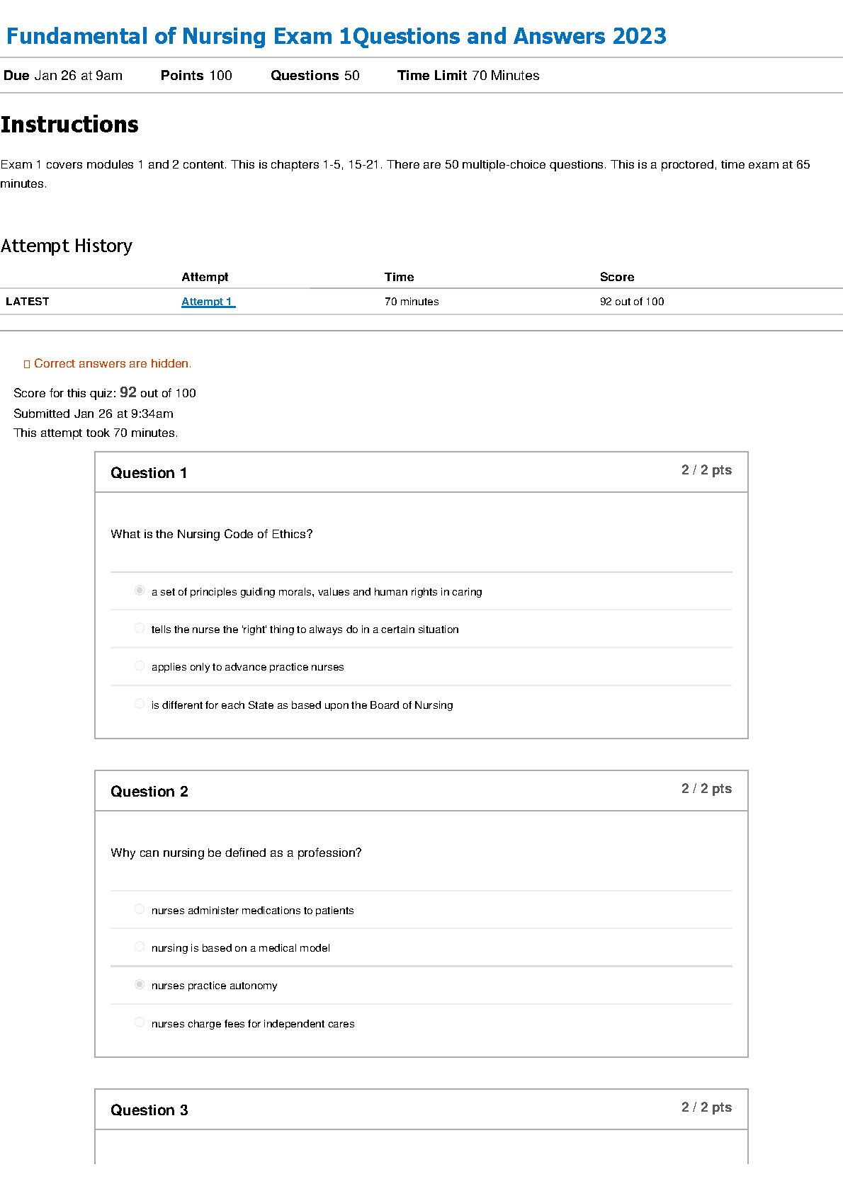 Ace your Fundamentals of Nursing Exam 1 with this comprehensive set of questions and answers. This resource covers modules 1 and 2, including chapters 1-5, 15-21, and features 50 multiple-choice questions designed to mimic the actual exam experience. This is a proctored, time-limited exam with a 70-minute time limit. Practice makes perfect!