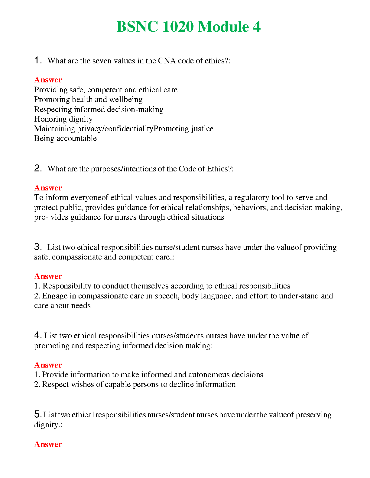 BSNC 1020 Module 4: Ethical Values and Responsibilities for Nurses (2024-2025 Edition)