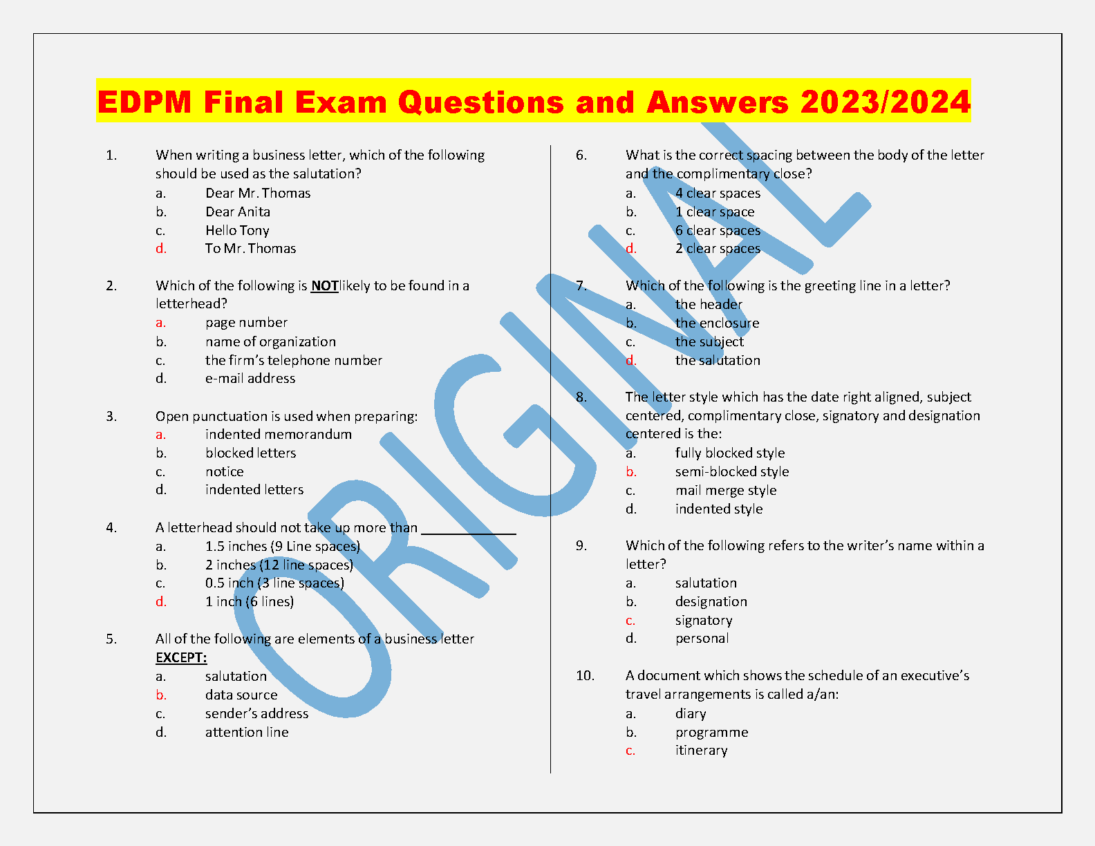 Prepare for your EDPM Final Exam with this comprehensive study guide, featuring the latest exam questions and answers. This resource covers essential concepts, ensuring you master the material and achieve success on your first attempt.