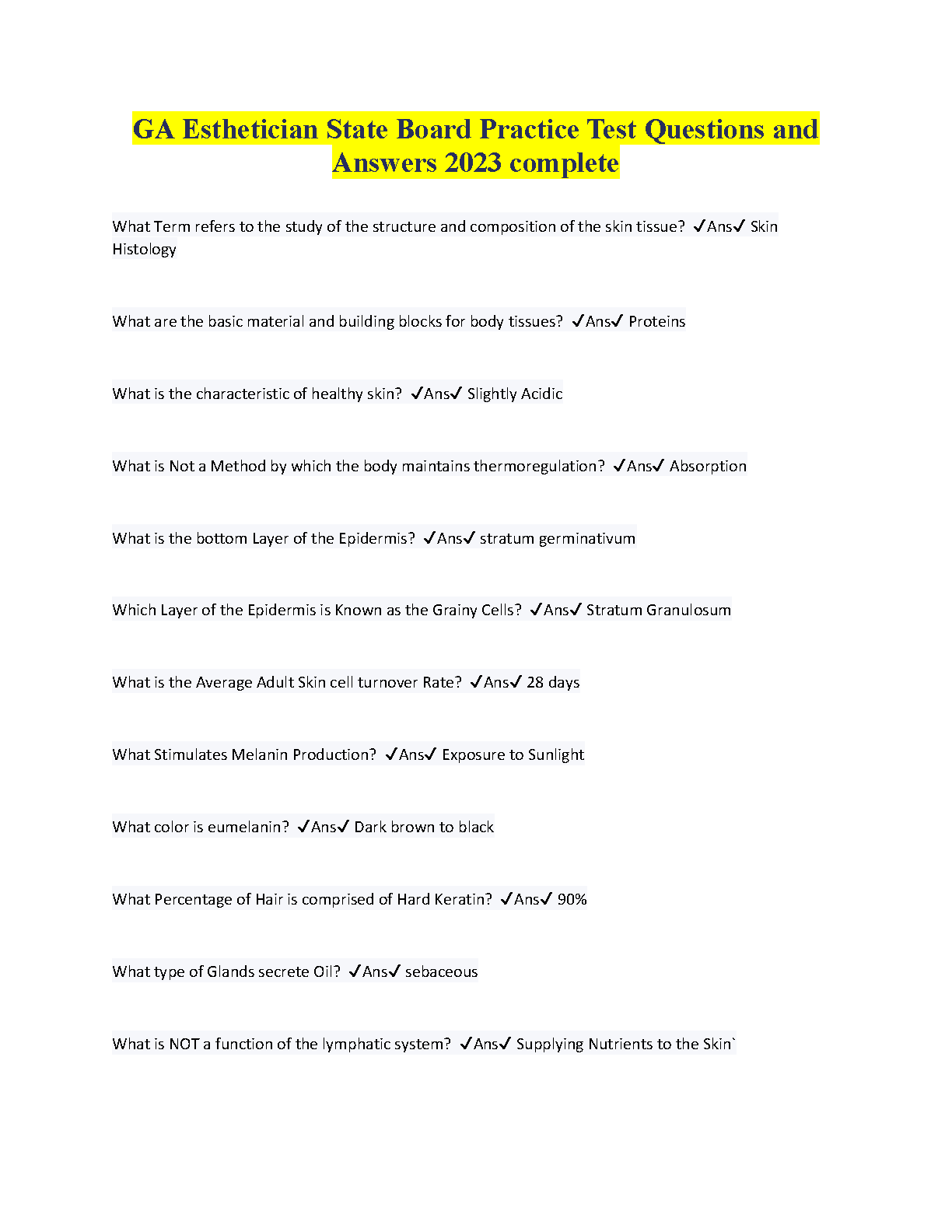 GA Esthetician State Board Practice Test Questions and Answers 2023 Complete - Ace Your Exam on the First Attempt