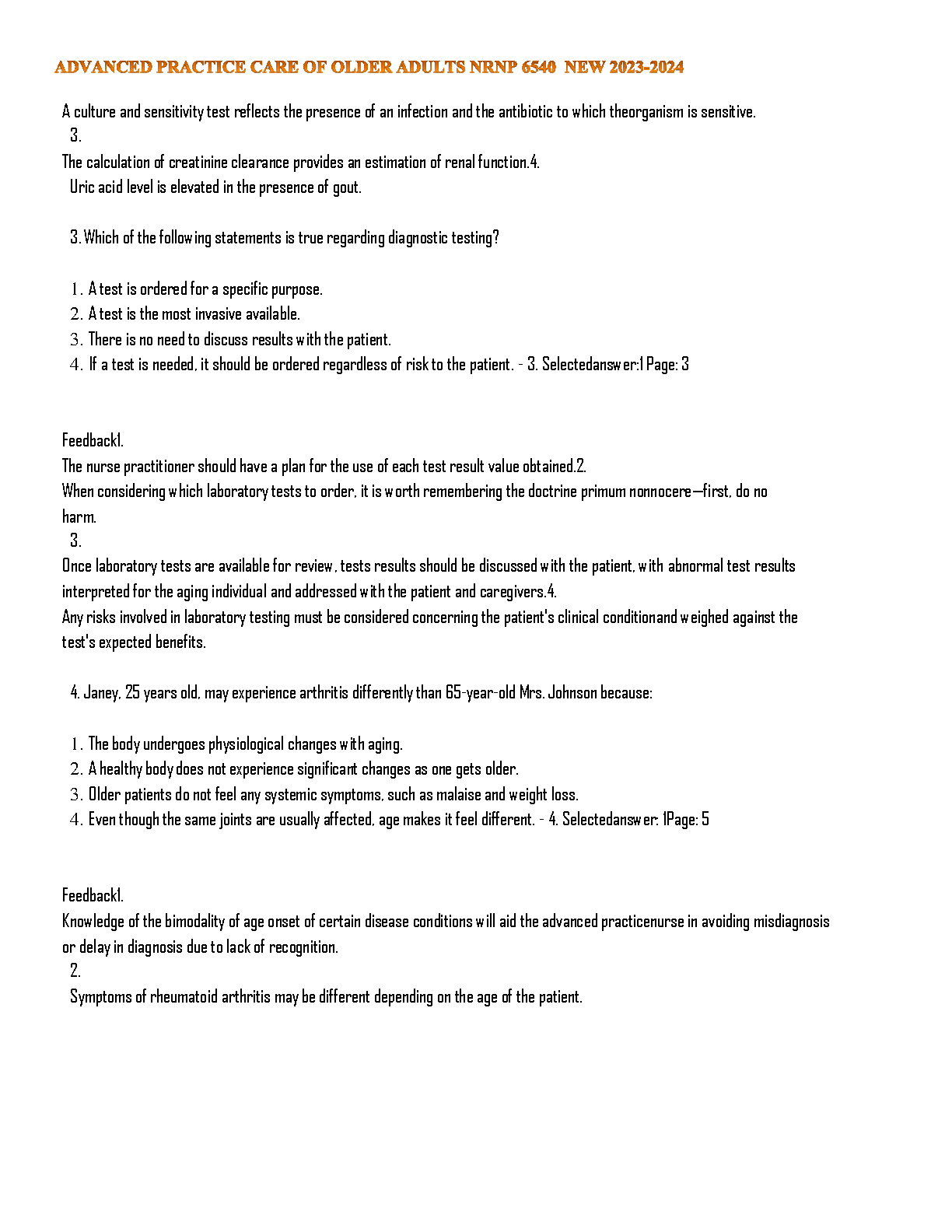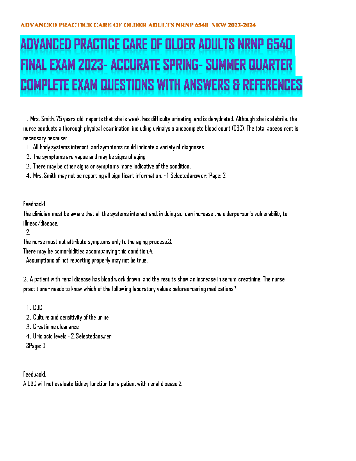 This is a comprehensive guide to help students ace their Advanced Practice Care of Older Adults NRNP 6540 final exam with confidence. It contains accurate and up-to-date exam questions, answers, and references to ensure success on the first attempt. The study material covers the essential concepts and clinical scenarios relevant to the exam, ensuring a solid understanding of the subject matter.