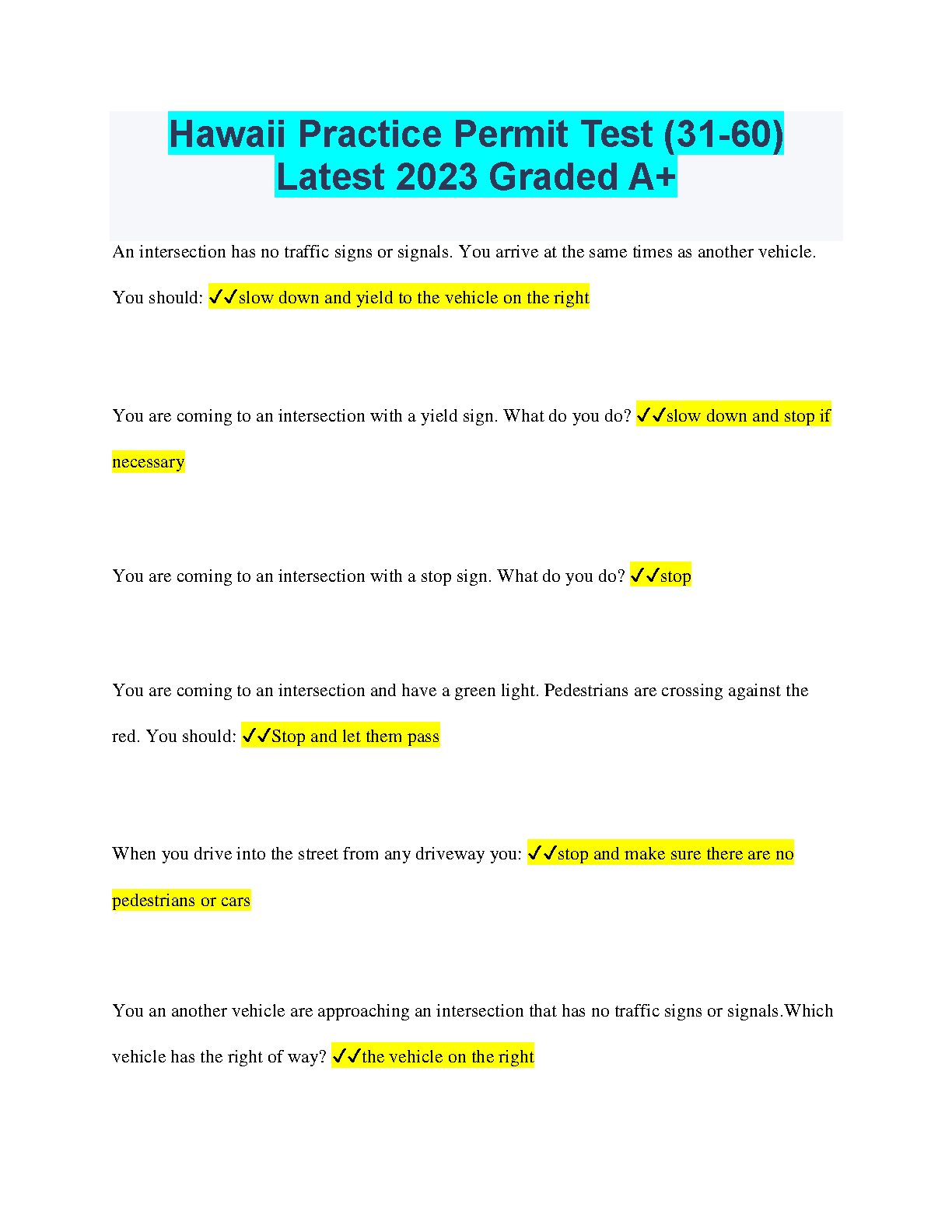 Ace your Hawaii Practice Permit Test with this comprehensive study guide covering questions 31-60. This latest 2023 graded A+ resource is designed to help you understand the key concepts and pass your exam on the first try, avoiding resits.
