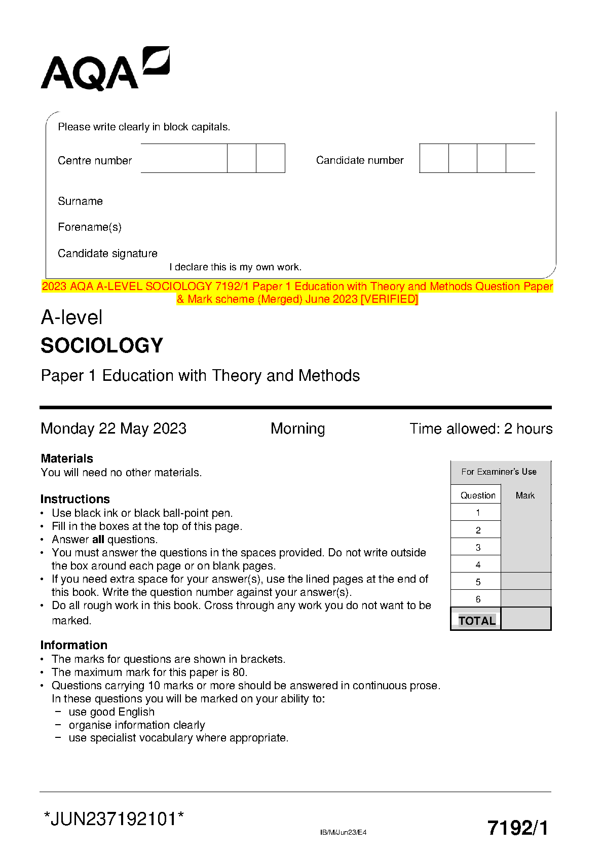 AQA A-Level Sociology 7192/1 Paper 1 Education with Theory and Methods Question Paper and Mark Scheme (Merged) June 2023 (VERIFIED) by Michael O'Shaughnessy, John Urry, Chris Gould, John Scott, Pam Slater