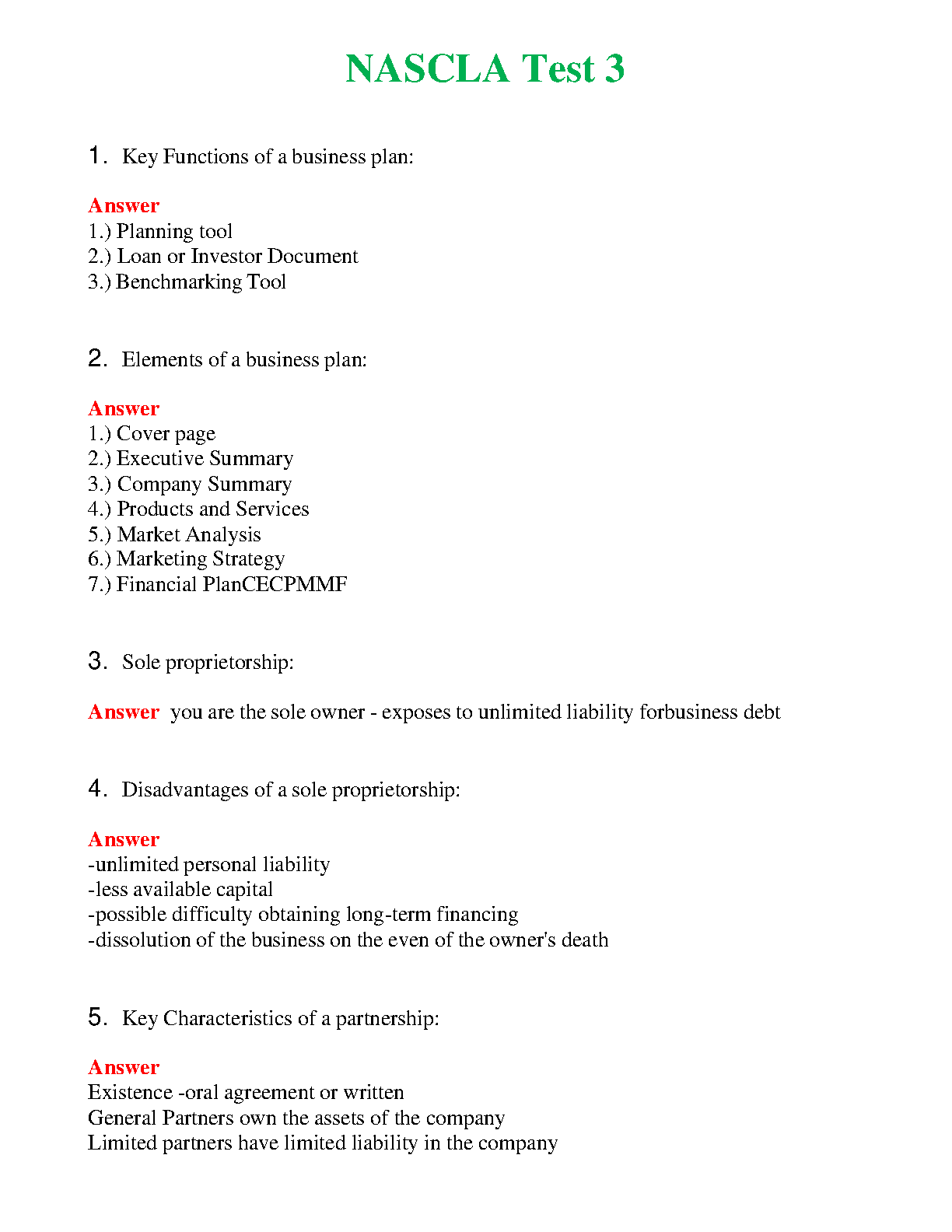 Ace your NASCLA exam on the first attempt with this comprehensive test bank covering key business concepts like planning, execution, and legal structures. This resource includes questions covering everything from basic business plan elements to the advantages and disadvantages of different business structures.