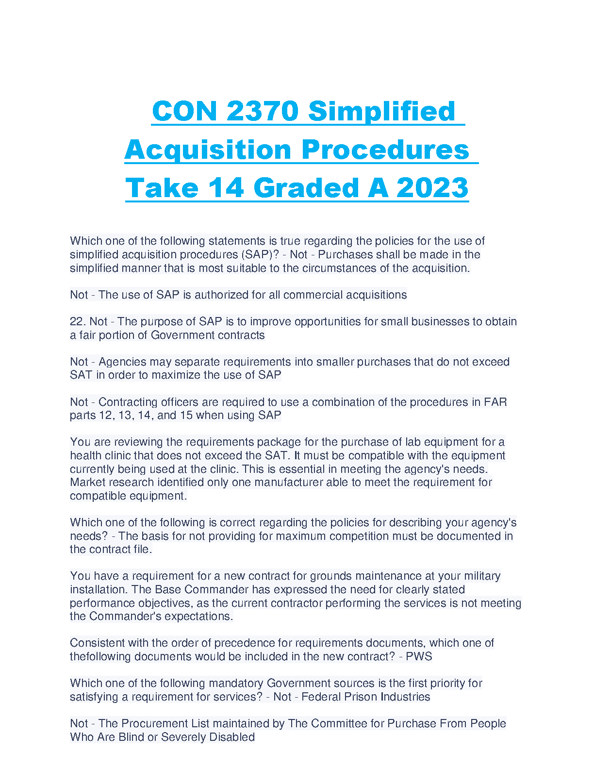 This resource is designed to help students pass their exams on the first attempt by providing them with access to the latest edition of CON 2370 Simplified Acquisition Procedures, Take 14 Graded A 2023, which covers all the essential topics needed to succeed in the course.