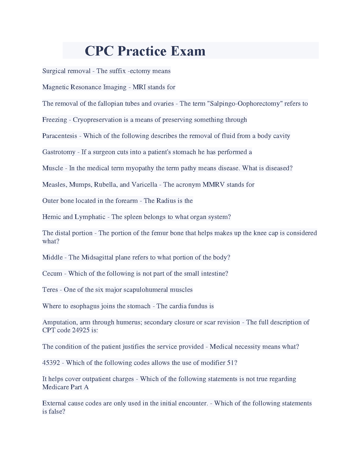 Get ready to ace your CPC exam! This practice exam covers key concepts and medical terminology to help you succeed. Practice with realistic questions and learn the ins and outs of medical coding.