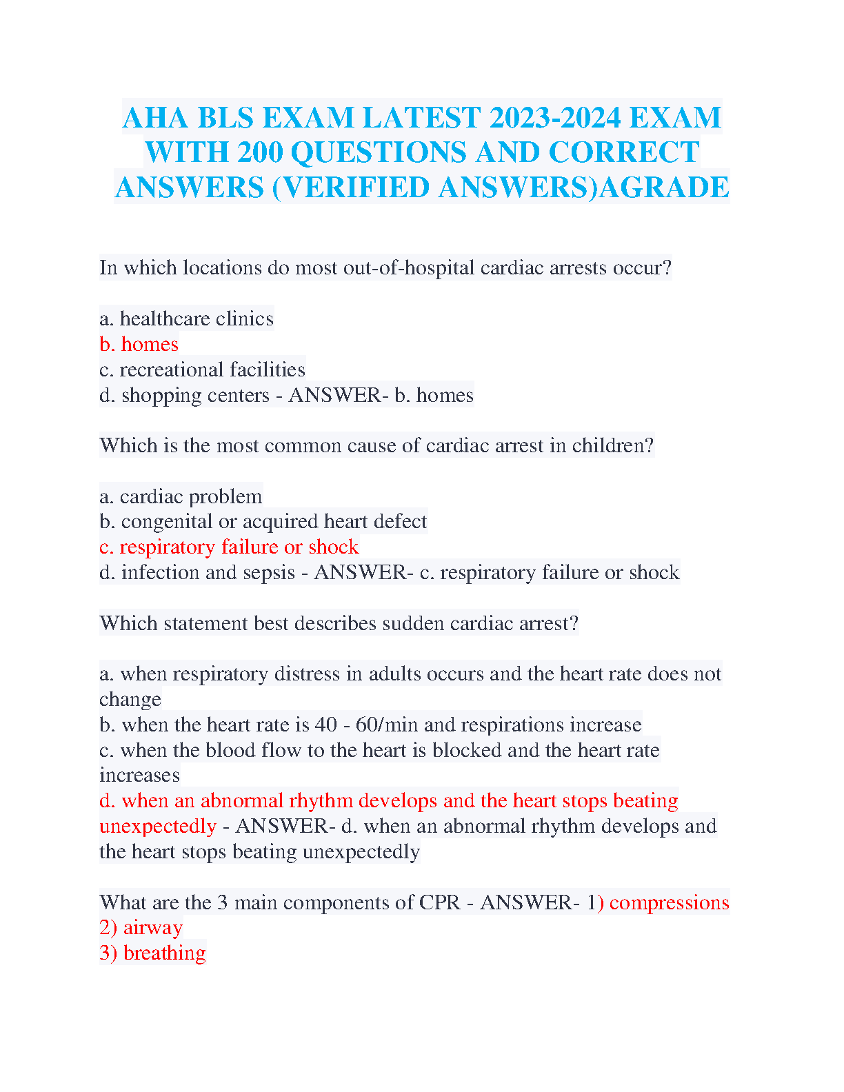 AHA BLS Exam Latest 2023-2024 Edition with 200 Questions and Correct Answers by American Heart Association