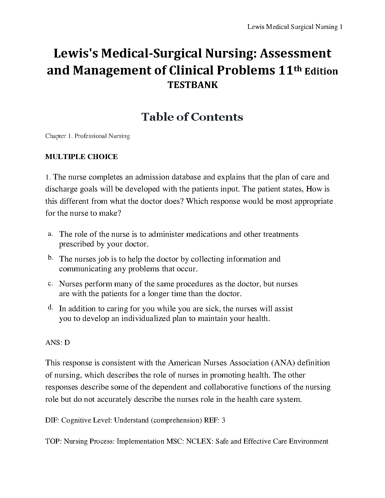 This test bank for Lewis's Medical-Surgical Nursing, 11th Edition is the perfect resource for students wanting to ace their nursing exams. This test bank is designed to help students understand the concepts and prepare for exams effectively, helping them avoid resits.