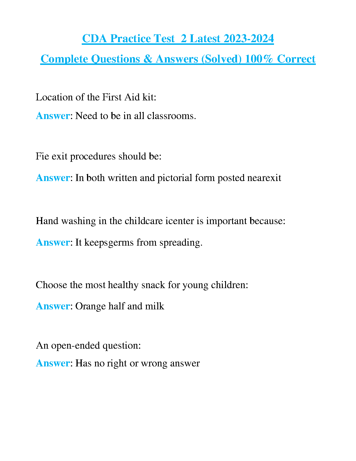 Ace your CDA exam with this comprehensive CDA Practice Test 2 for the 2023-2024 academic year. This resource includes all the latest questions and answers, solved with 100% accuracy. It's perfect for those aiming to pass on their first attempt and avoid resits.