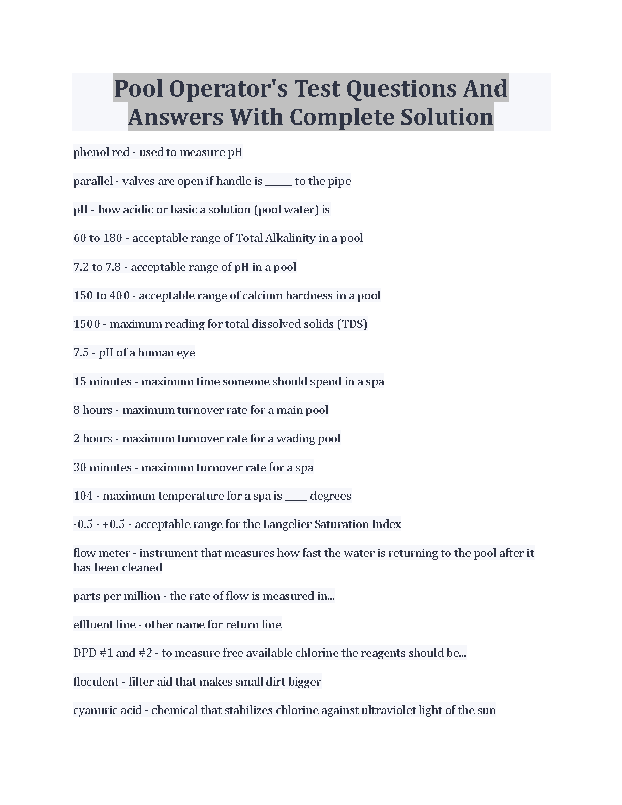 Pool Operator's Test Questions and Answers With Complete Solution - 2024 Edition