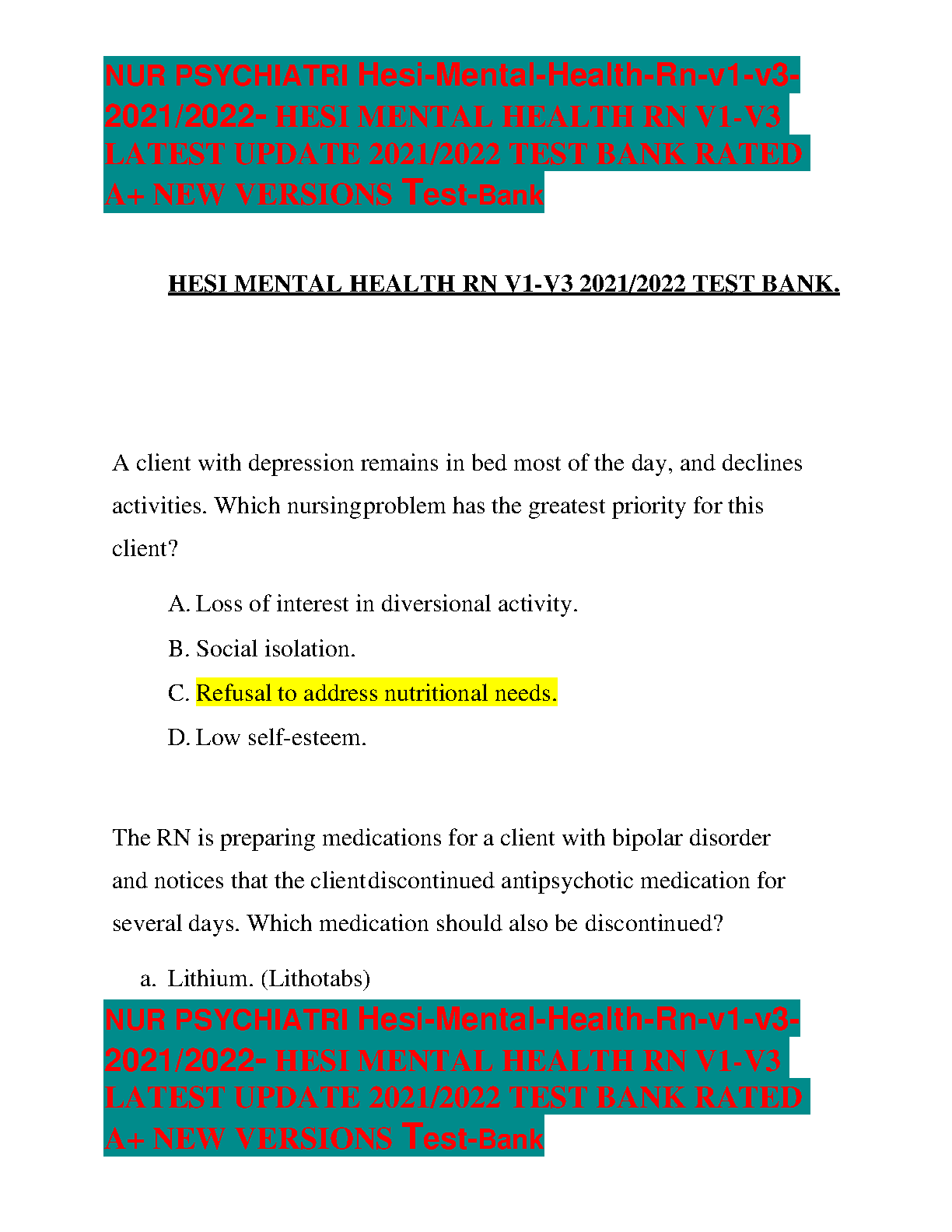 This is the HESI Mental Health RN Test Bank for V1-V3. It is a collection of questions and answers for the HESI Mental Health RN exam. The test bank is designed to help students prepare for their exam and is updated regularly with the latest information.