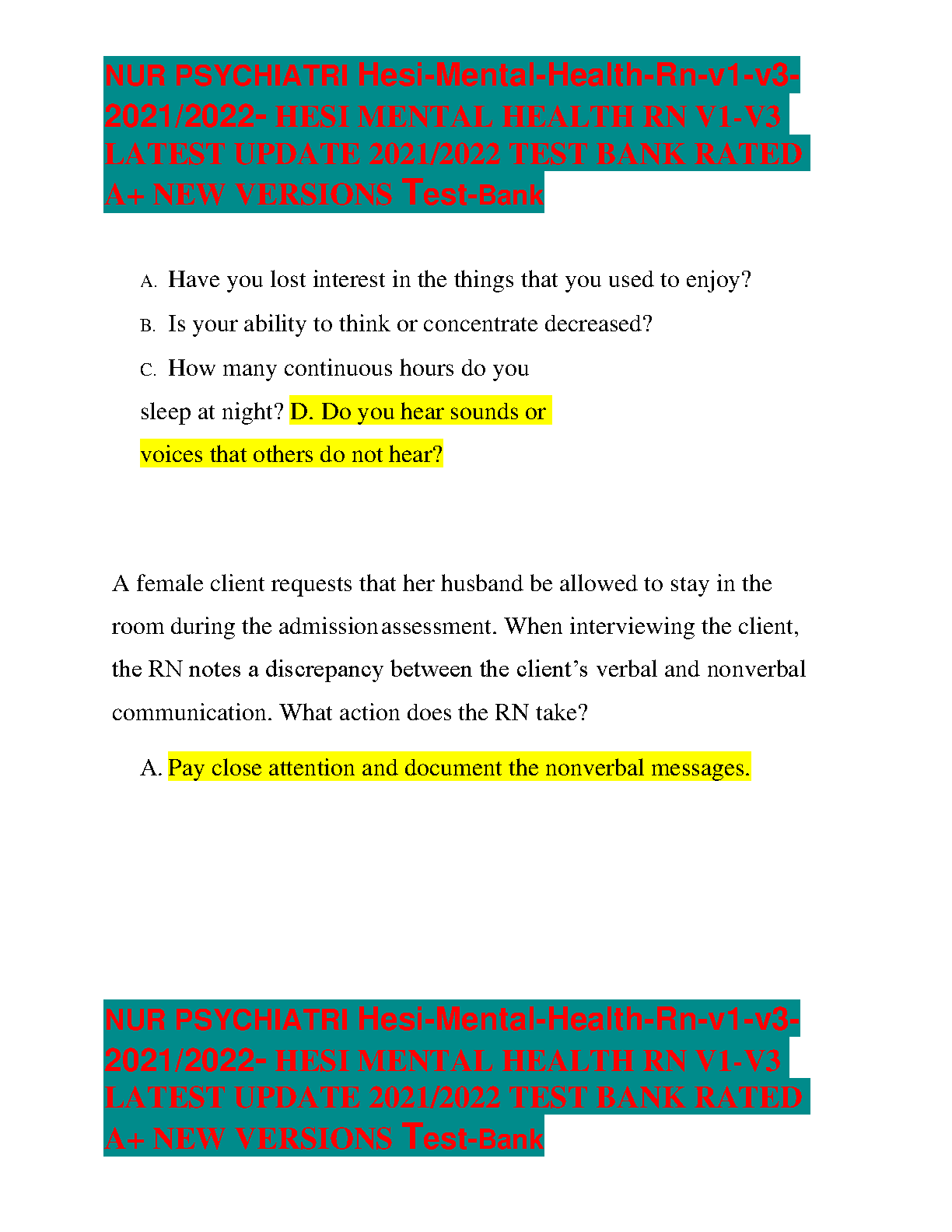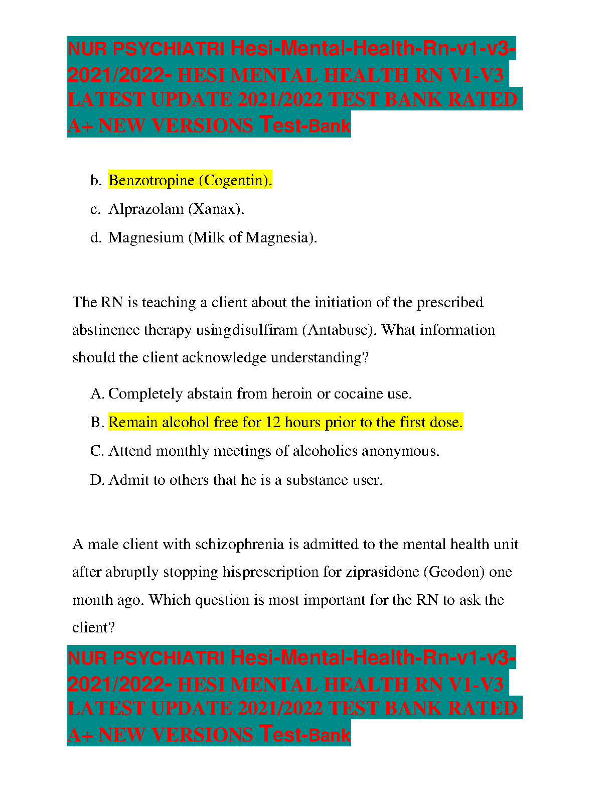 HESI Mental Health RN V1-V3 2021/2022 Test Bank by HESI