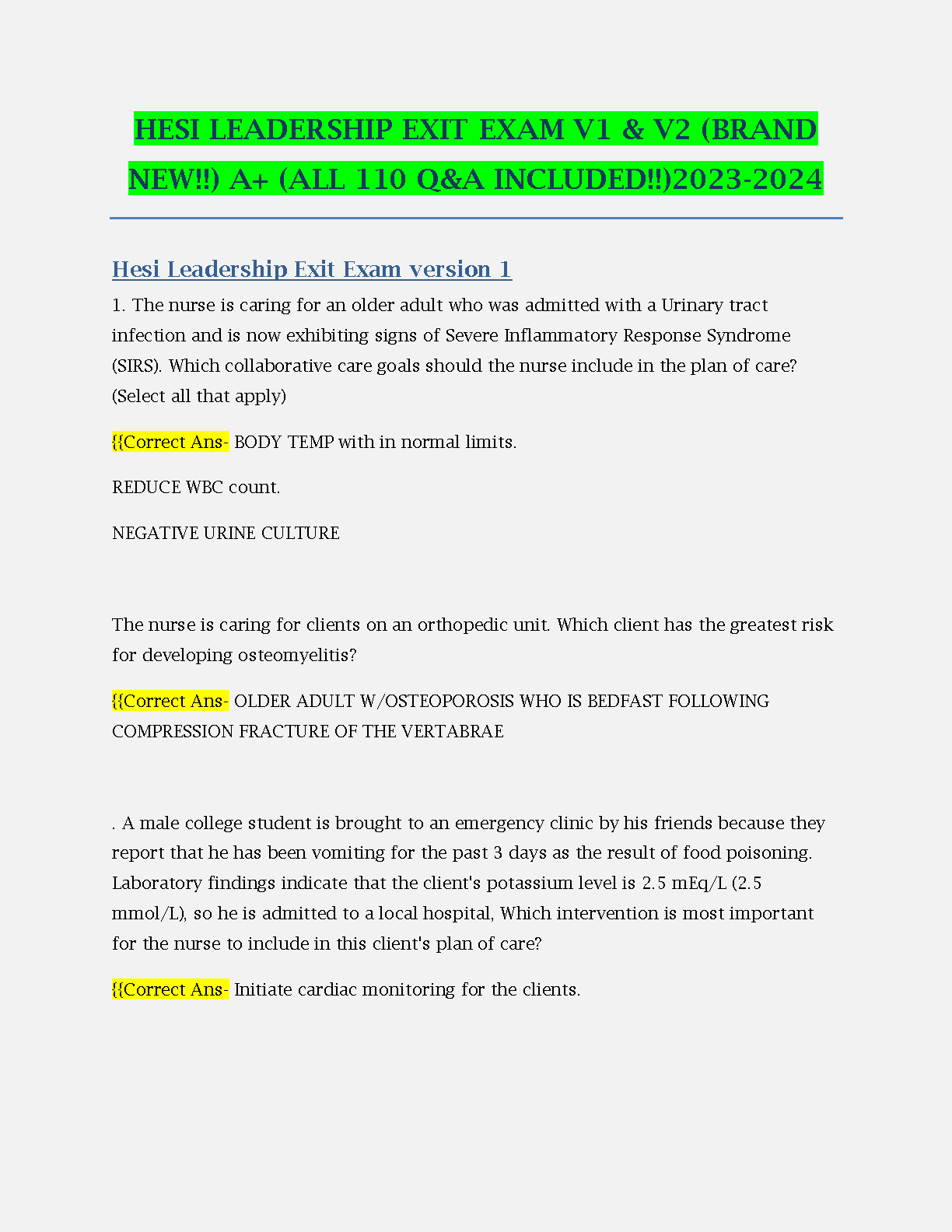 HESI Leadership Exit Exam V1 & V2 (BRAND NEW!!) A+ (ALL 110 Q&A INCLUDED!) 2023-2024 - Latest Edition by Linda Anne