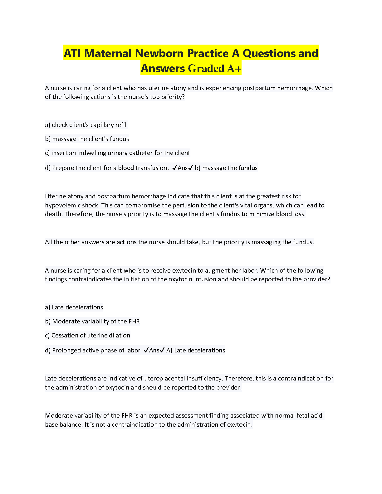 ATI Maternal Newborn Practice A Questions and Answers Graded A+ - Latest Edition for 2024/2025 - Guaranteed Success on First Attempt - Avoid Resits
