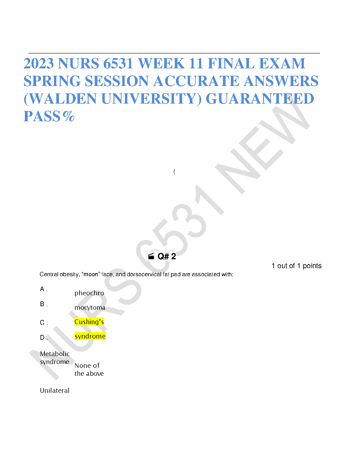 NURS 6531 Week 11 Final Exam Spring Session Accurate Answers (Walden University) Guaranteed Pass % - 2024/2025 Edition