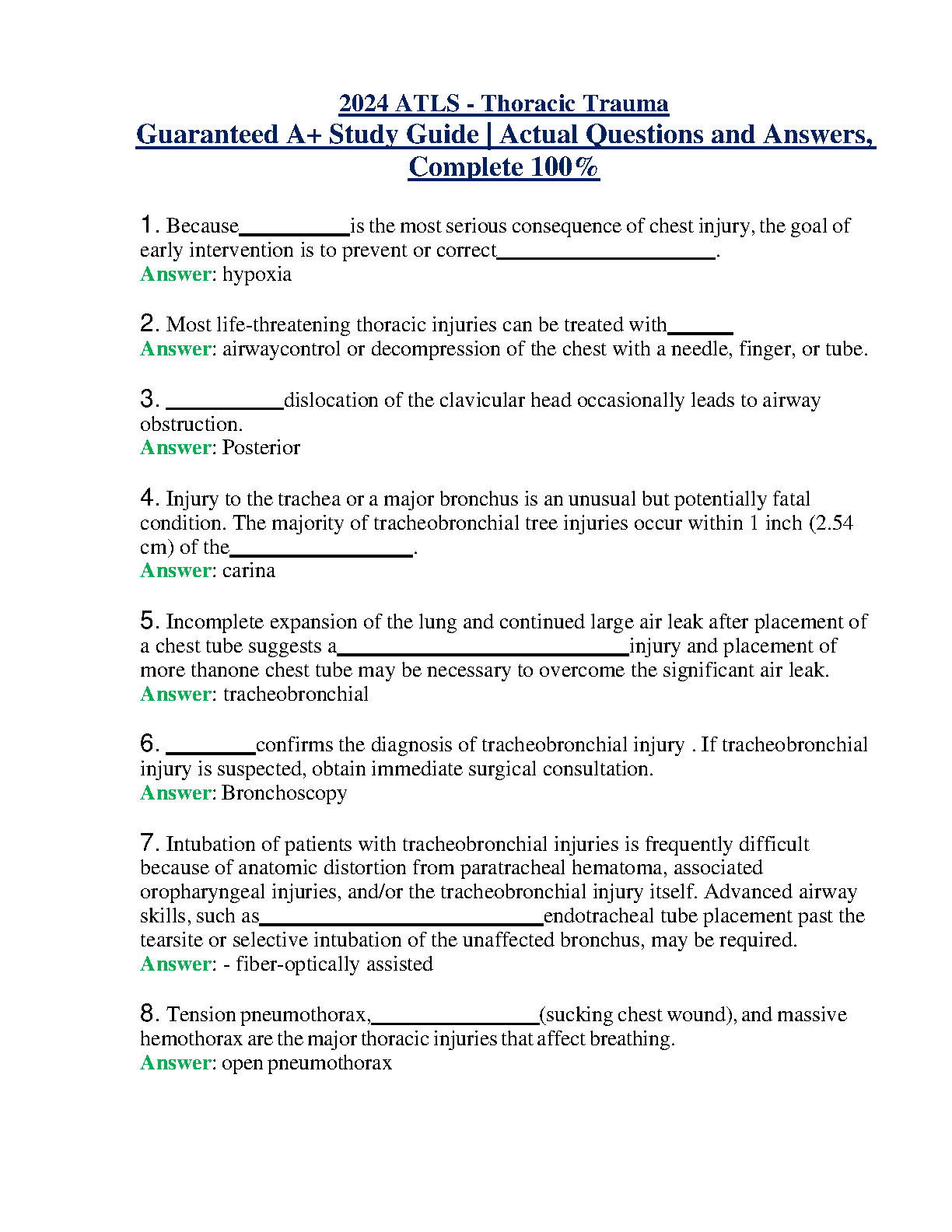 2024 ATLS - Thoracic Trauma Study Guide | Actual Questions and Answers, Complete 100% by James C. Holcroft, MD, FACS, Timothy C. Fabian, MD, FACS, David B. Hoyt, MD, FACS, John M. Cimino, MD, FACS, Matthew J. Jurkovich, MD, FACS, and Daniel J. Demetriades