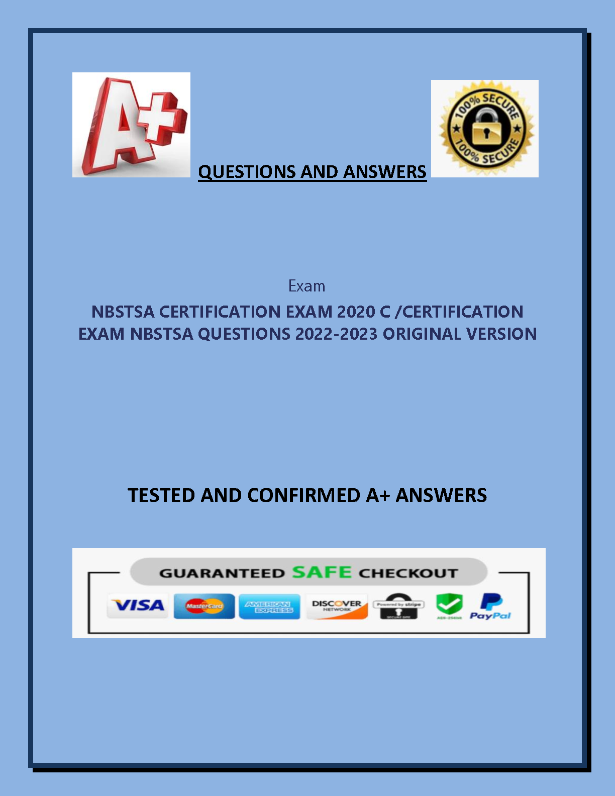 This resource contains the latest edition of the NBTSA Certification Exam 2020 C/ Certification Exam NBTSA Questions 2022-2023 Original Version. This study guide is designed to help you pass the exam on your first attempt and avoid resits.