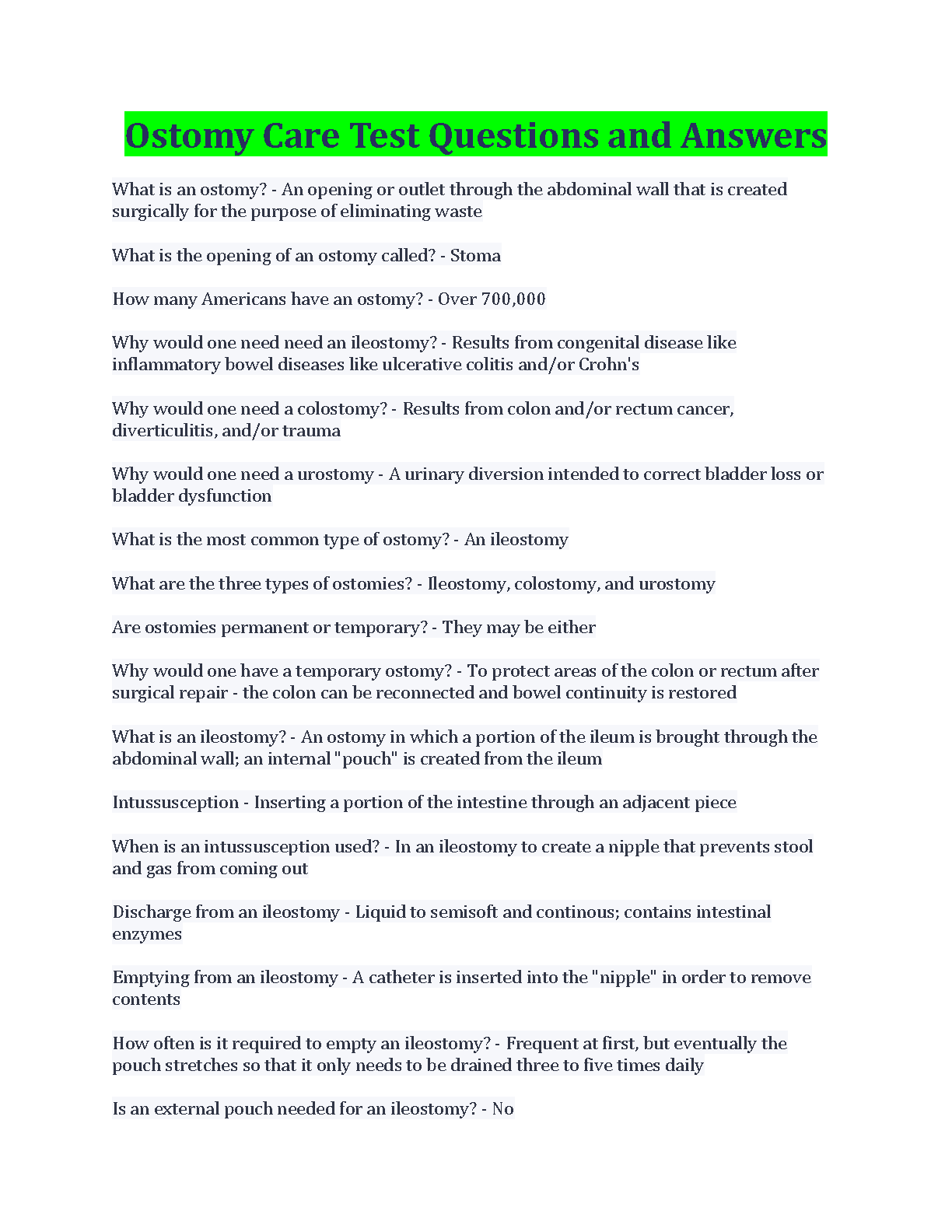 This resource offers a comprehensive set of ostomy care test questions and answers, meticulously designed to prepare nurses and healthcare professionals for success in their exams. It covers a wide range of topics related to ostomy care, including types of ostomies, care procedures, complications, and patient education.