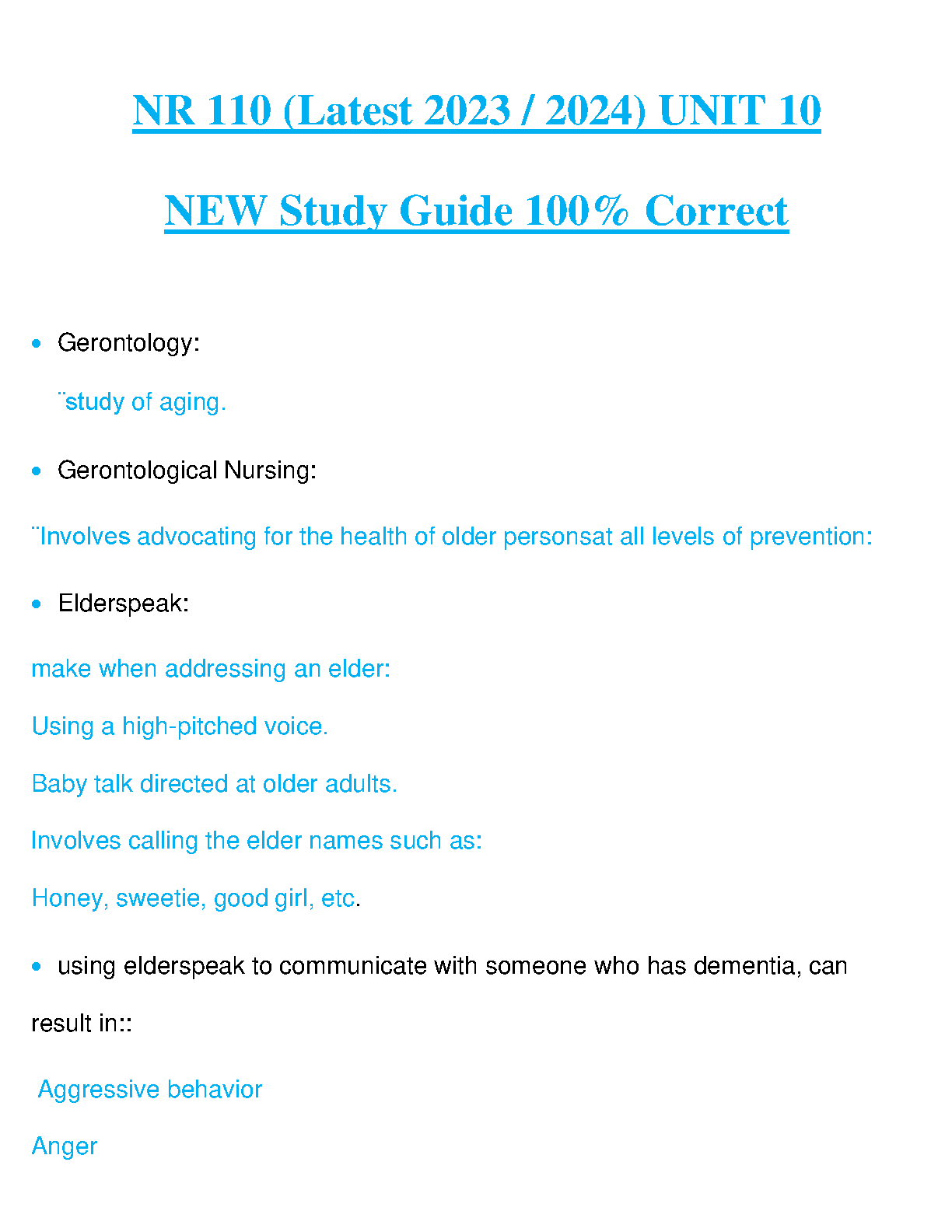 NR 110 (Latest 2023/2024) UNIT 10 Study Guide - Gerontology and Gerontological Nursing for Success in Exams