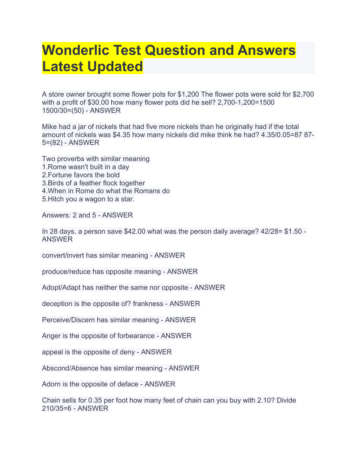Wonderlic Test Question and Answers Latest Updated BRAND NEW!!!. DOWNLOAD on www.hackedexams.com INSTANTLY.