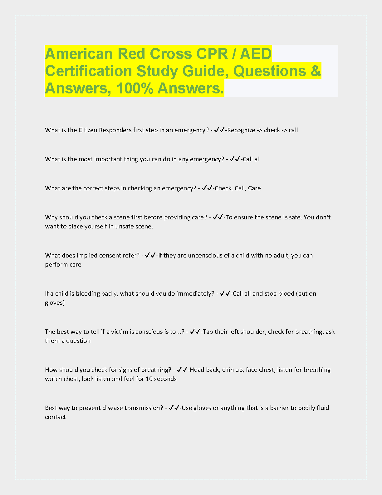American Red Cross CPR/AED Certification Study Guide, Questions & Answers, 100% Answers by Anonymous