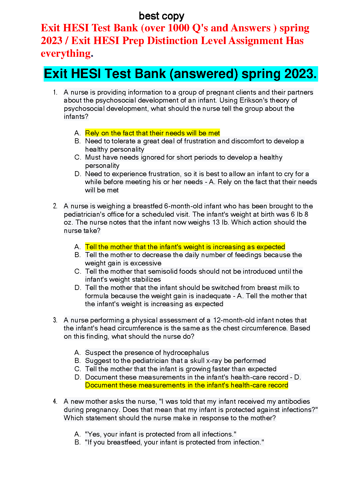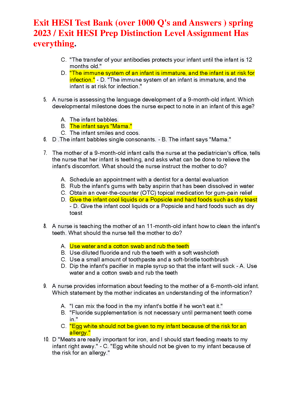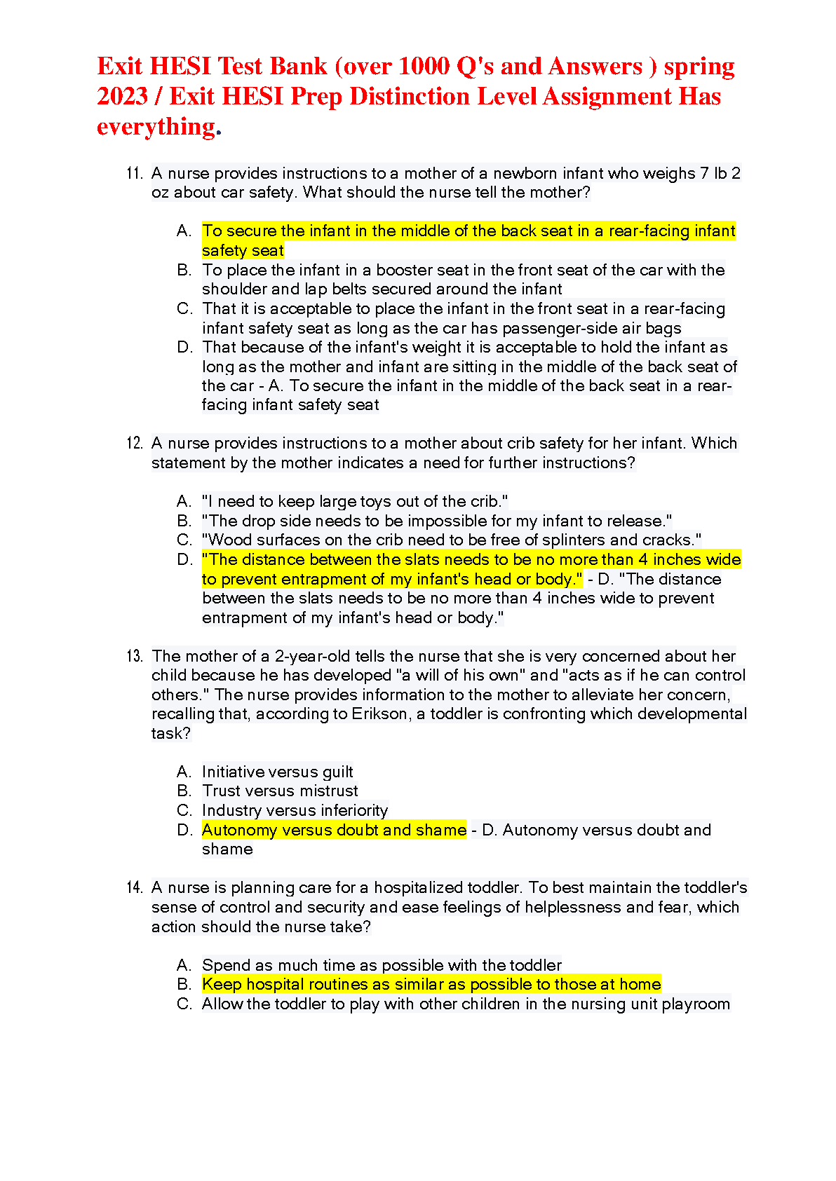 Exit HESI Test Bank (Answered) Spring 2023: Over 1000 Q&A's for Exam Success