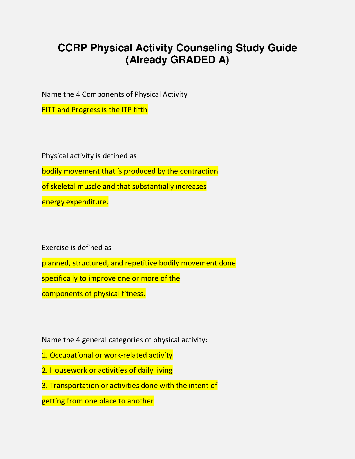 This comprehensive study guide is designed to help you ace your CCR Physical Activity Counseling exams on the first attempt. It covers all the essential topics, including the 4 components of physical activity, the definition of physical activity and exercise, and the 4 general categories of physical activity. This guide is ideal for students looking for a clear and concise resource to understand the fundamentals of physical activity counseling.
