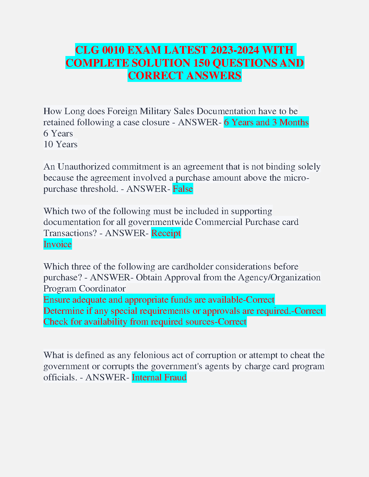CLG 0010 Exam Latest 2023-2024 with Complete Solution 150 Questions and Correct Answers