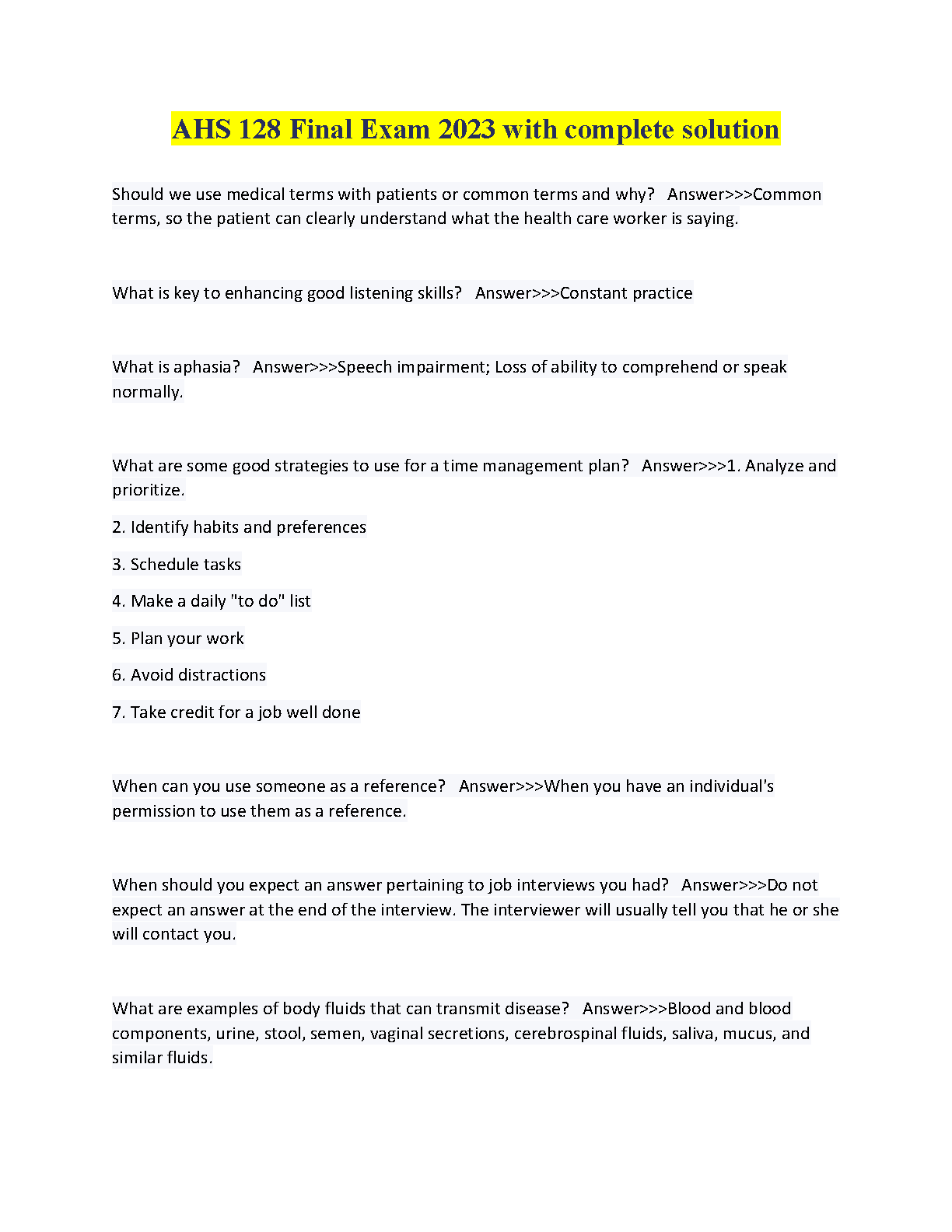 AHS 128 Final Exam 2023 with Complete Solution is a comprehensive resource for students preparing for their AHS 128 final exam. It covers all the essential topics and provides detailed answers to every question, making it the perfect study companion.
