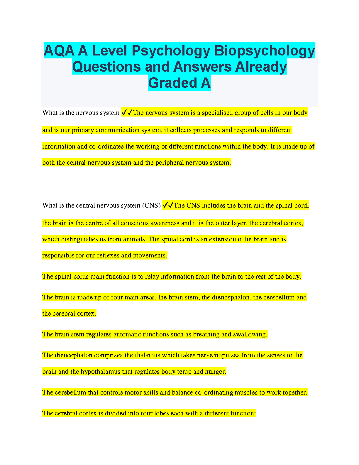 AQA A Level Psychology Biopsychology Questions and Answers by - Complete Guide for Exam Success in 2024/2025