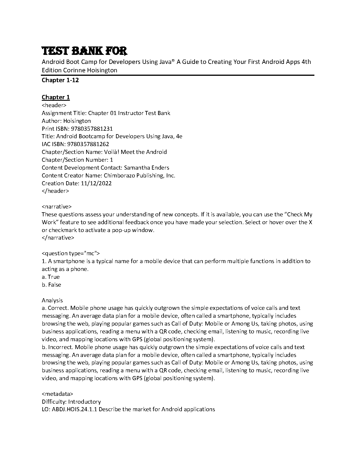 This Test Bank for the 4th edition of Android Bootcamp for Developers Using Java by Corinne Hoisington will help you master the fundamental concepts of Android development. It is designed to help you ace your exams and get you on the path to becoming a successful Android developer.