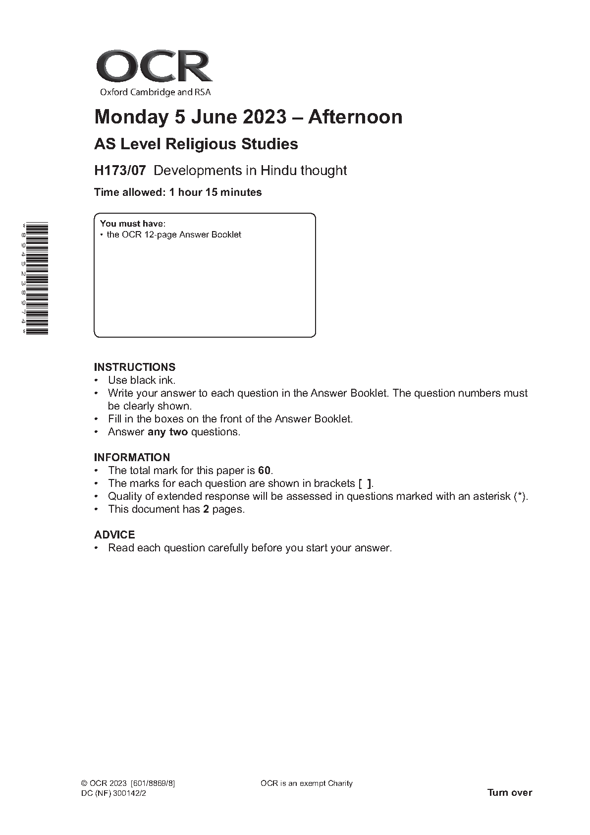 OCR AS Level Religious Studies - Developments in Hindu thought - June 2023 Exam Paper