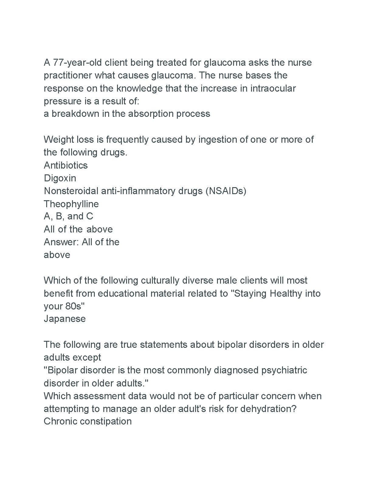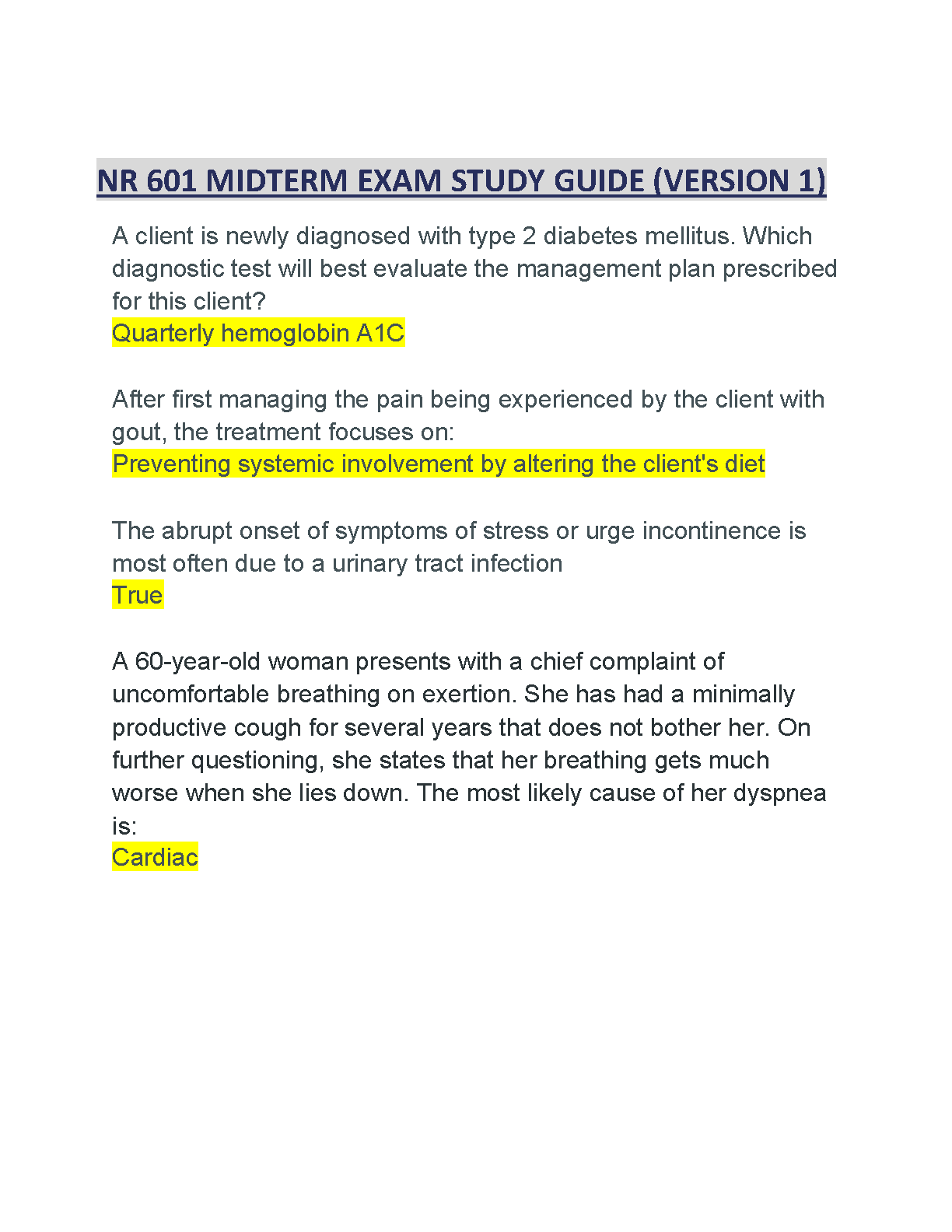 This comprehensive study guide for NR 601 Midterm Exam (Version 1) is designed to help nursing students master the crucial concepts and prepare for their exam with confidence. It covers essential topics like diabetes mellitus management, pain management, systemic involvement, and respiratory conditions, offering insights and explanations to help you succeed on your first attempt.