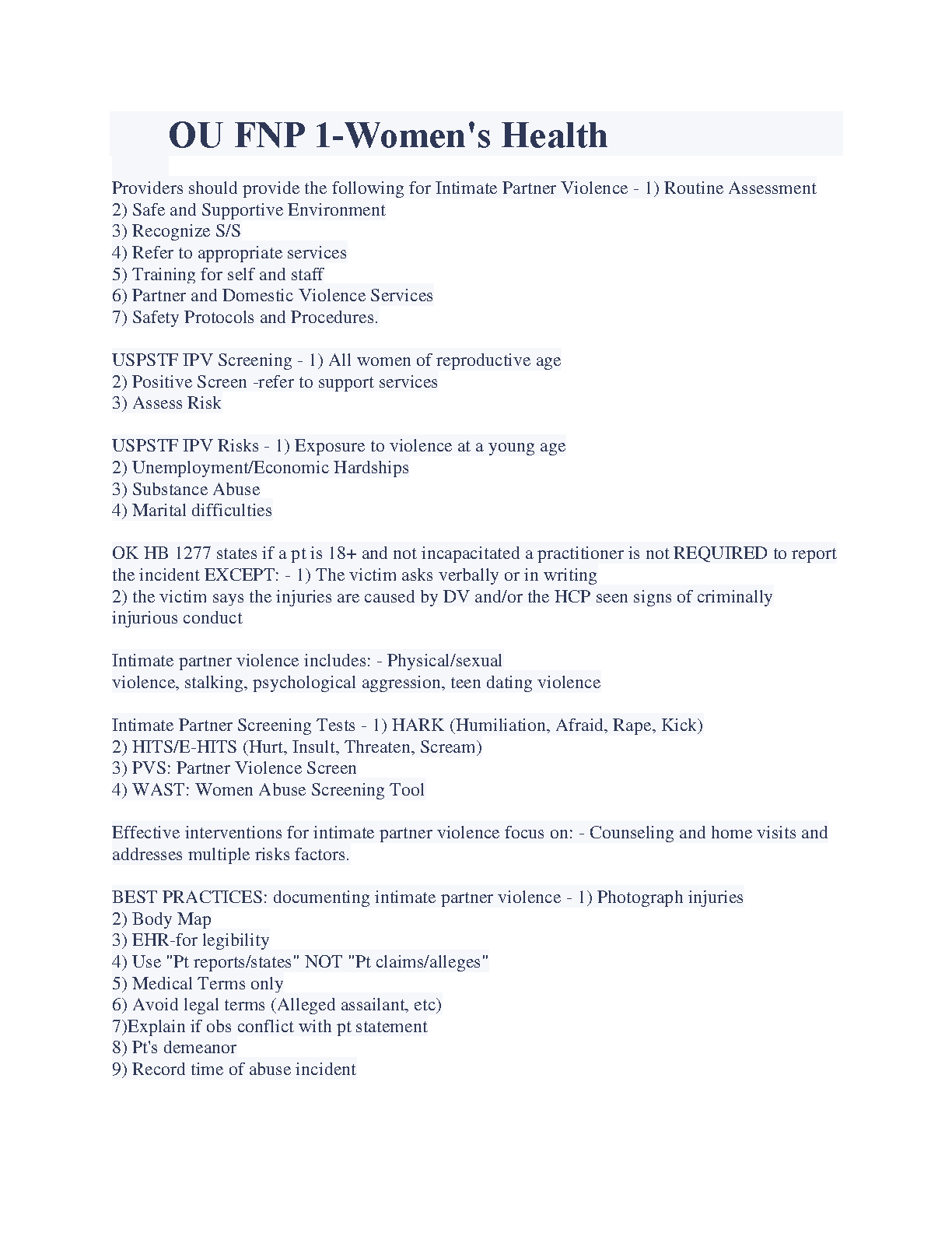 This comprehensive guide explores essential aspects of women's health in the context of OU FNP 1 curriculum. Discover effective strategies for identifying, addressing, and managing intimate partner violence, including best practices for documentation, risk factors, and intervention methods. The content is ideal for nursing students seeking to excel in their first attempt at exams and avoid resits.