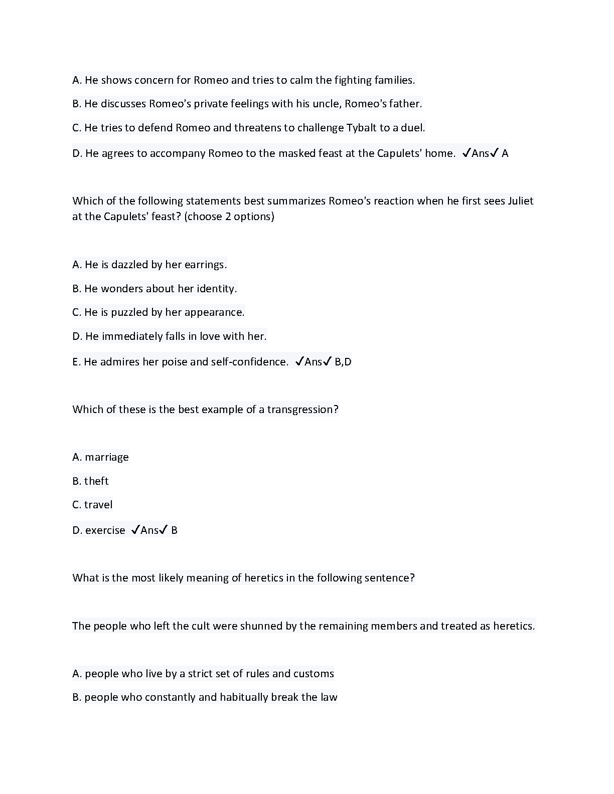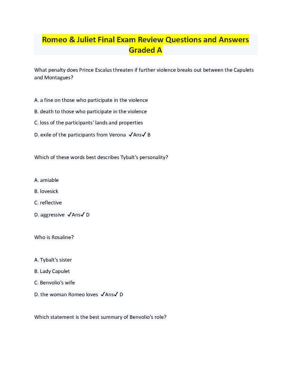 This resource contains practice questions and answers for the final exam of Romeo and Juliet. It is designed to help students prepare for their exam and avoid retakes.