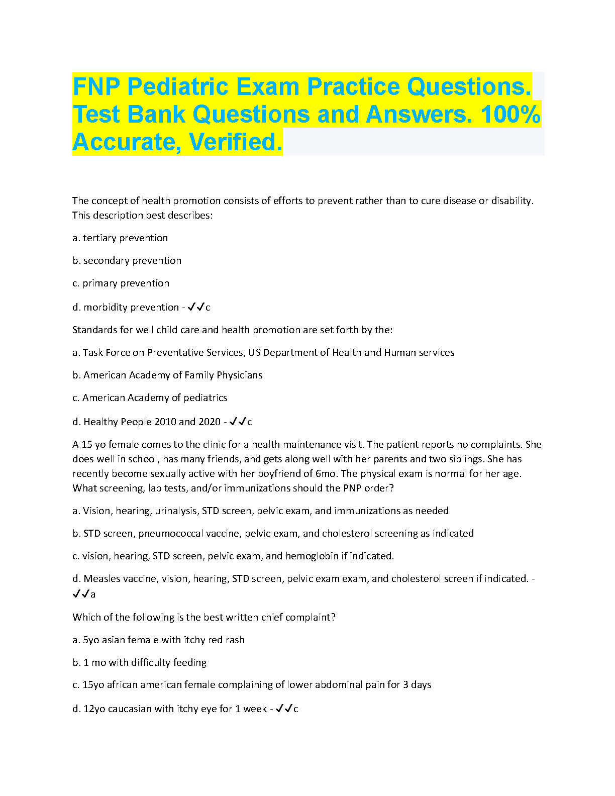 FNP Pediatric Exam Practice Questions: Test Bank Questions and Answers. 100% Accurate, Verified.