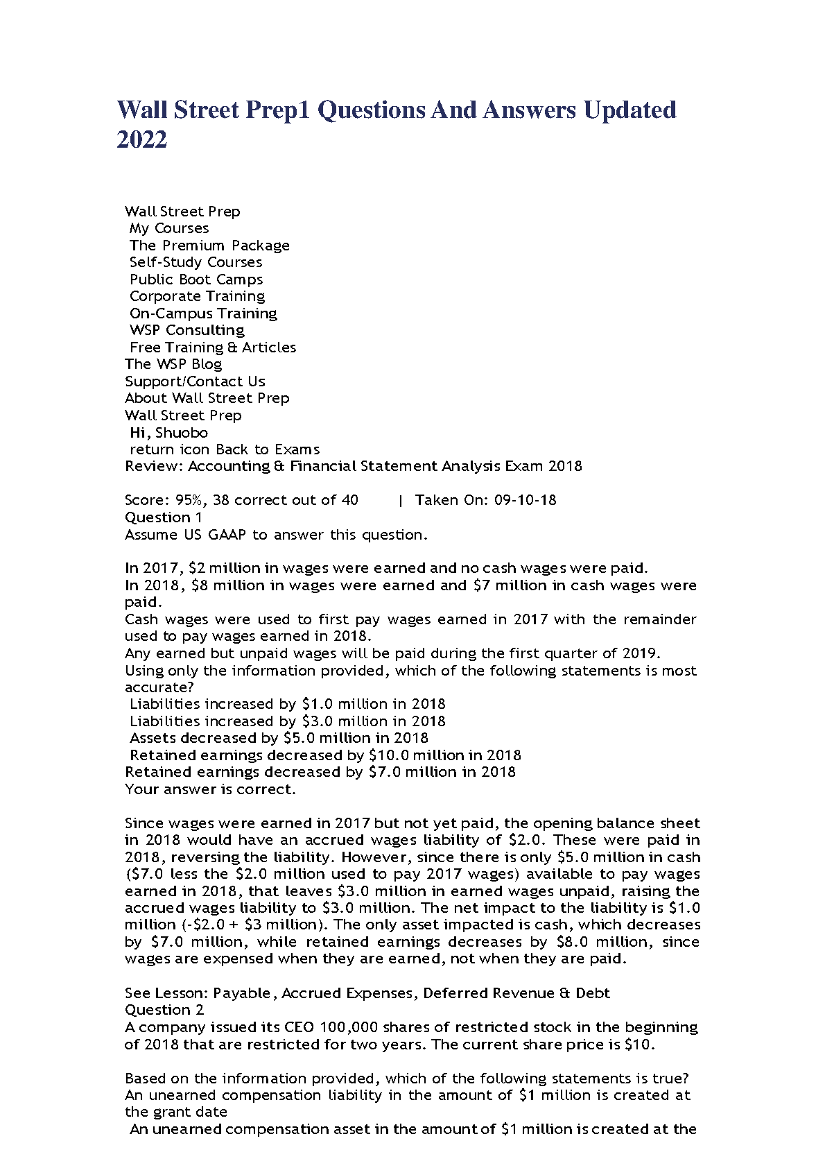 Wall Street Prep1 Questions And Answers Updated 2022 - Accounting & Financial Statement Analysis Exam 2018 by Shuobo